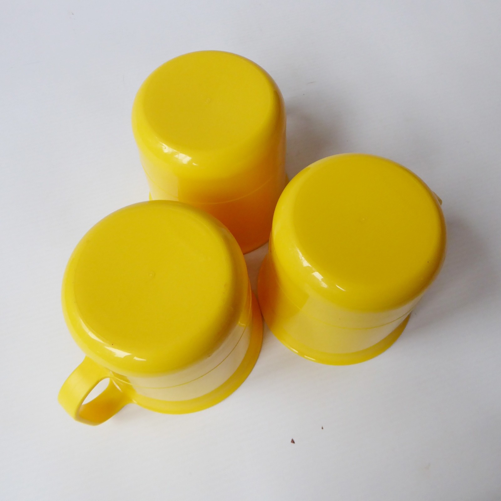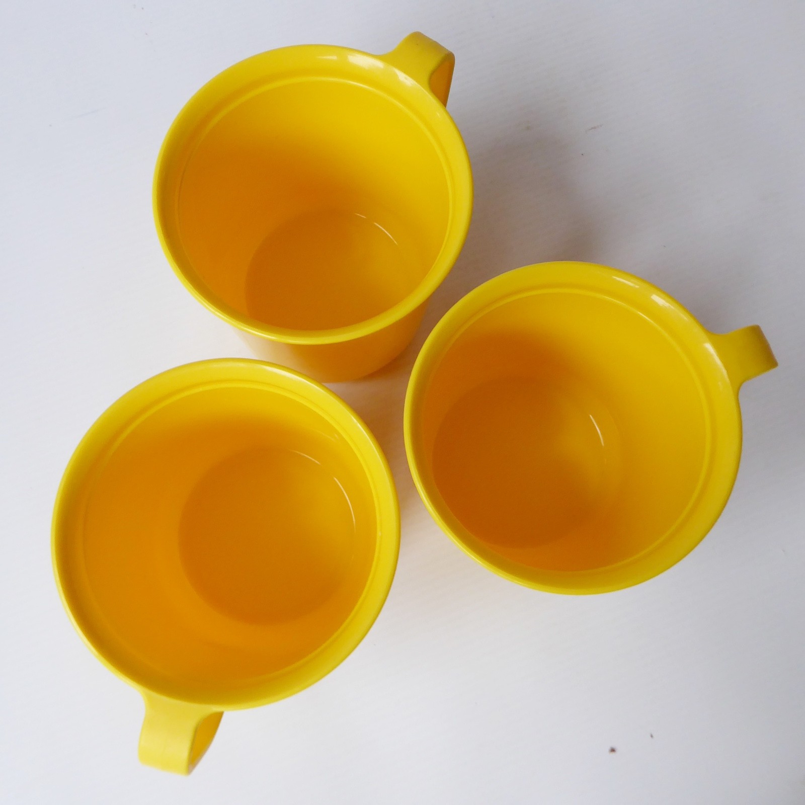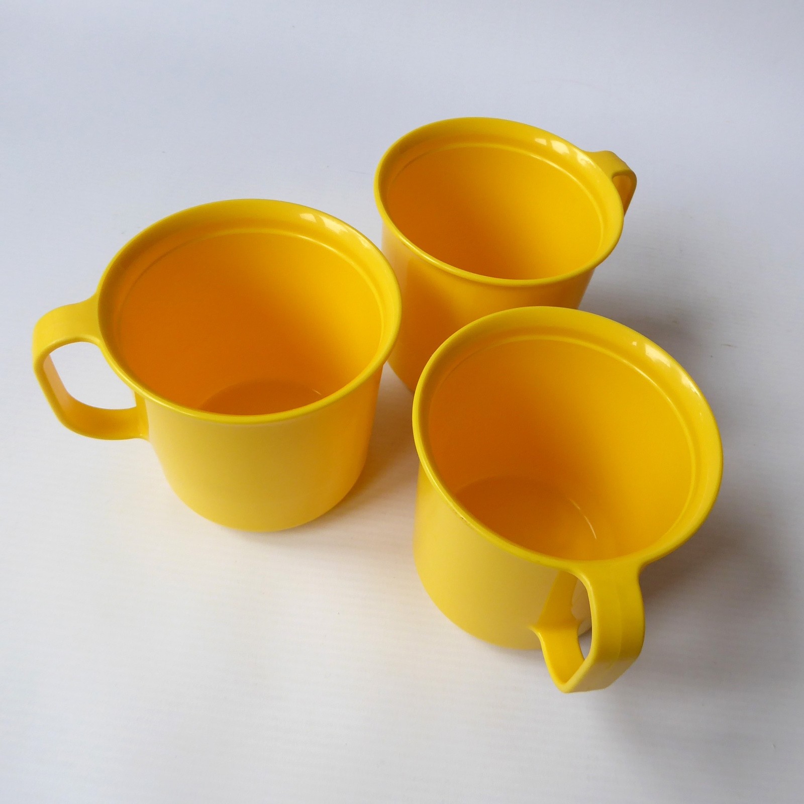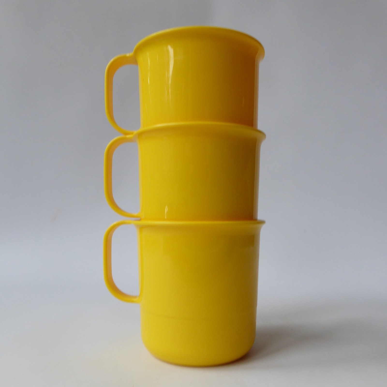 A set of three hard-to-find 1980s Tupperware larger bright yellow mugs.
