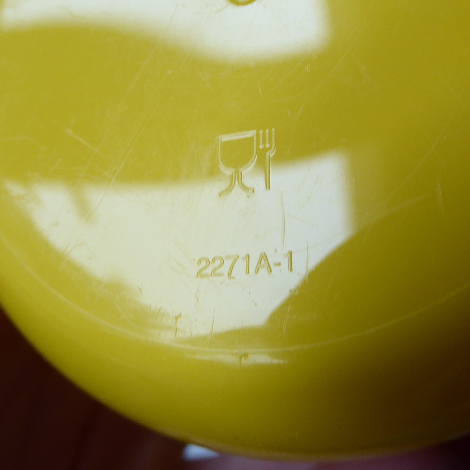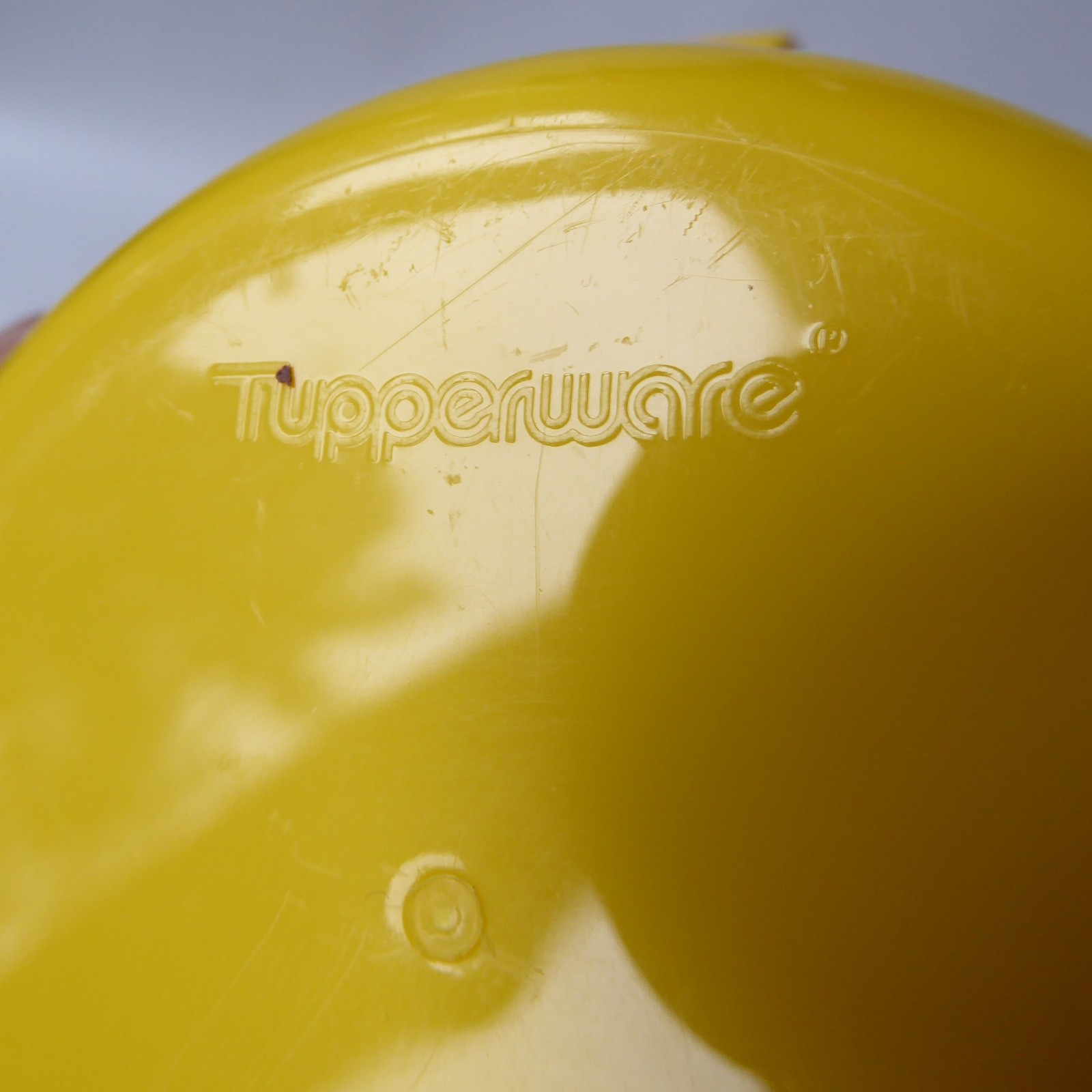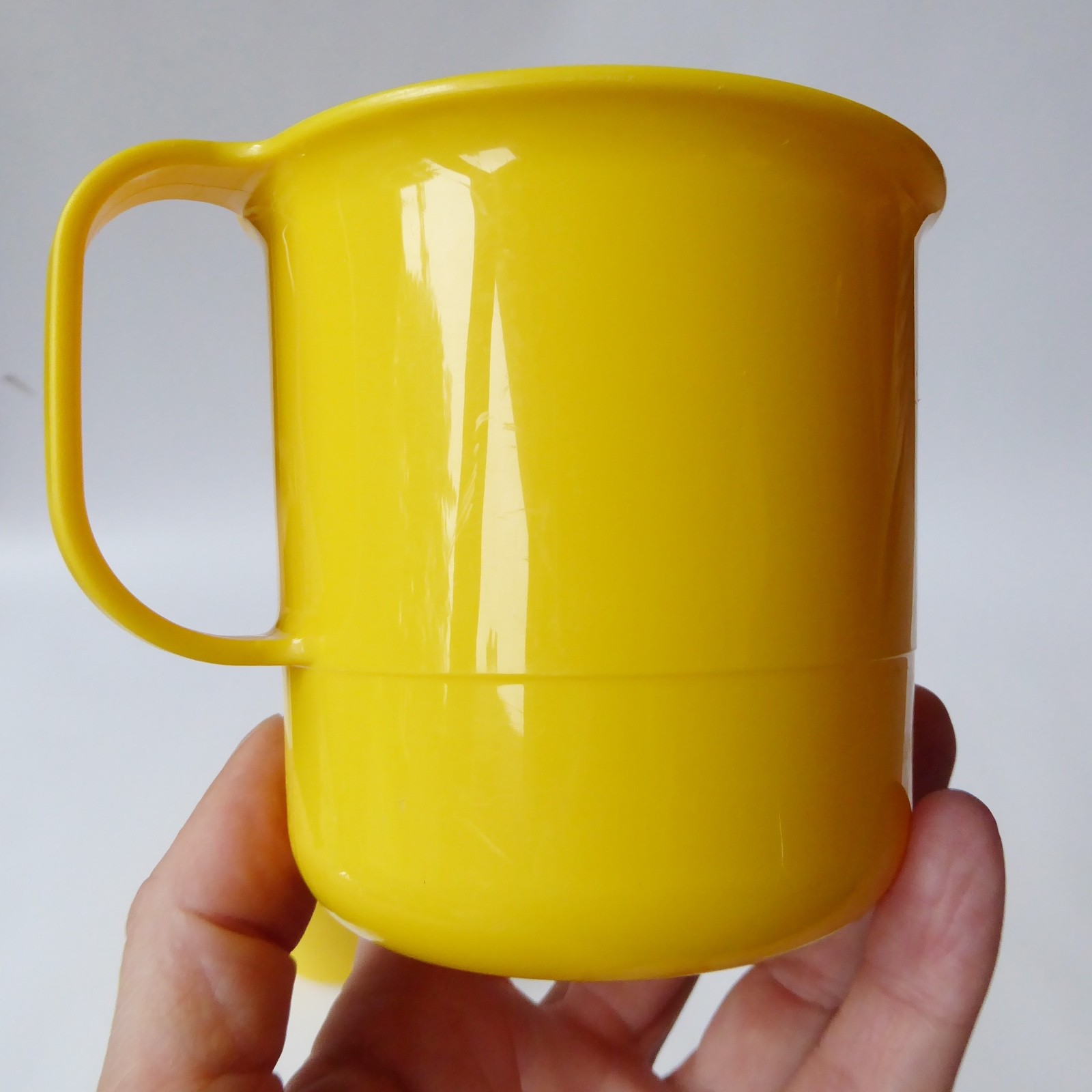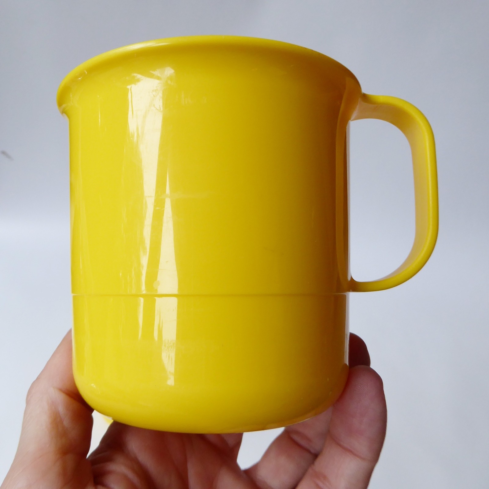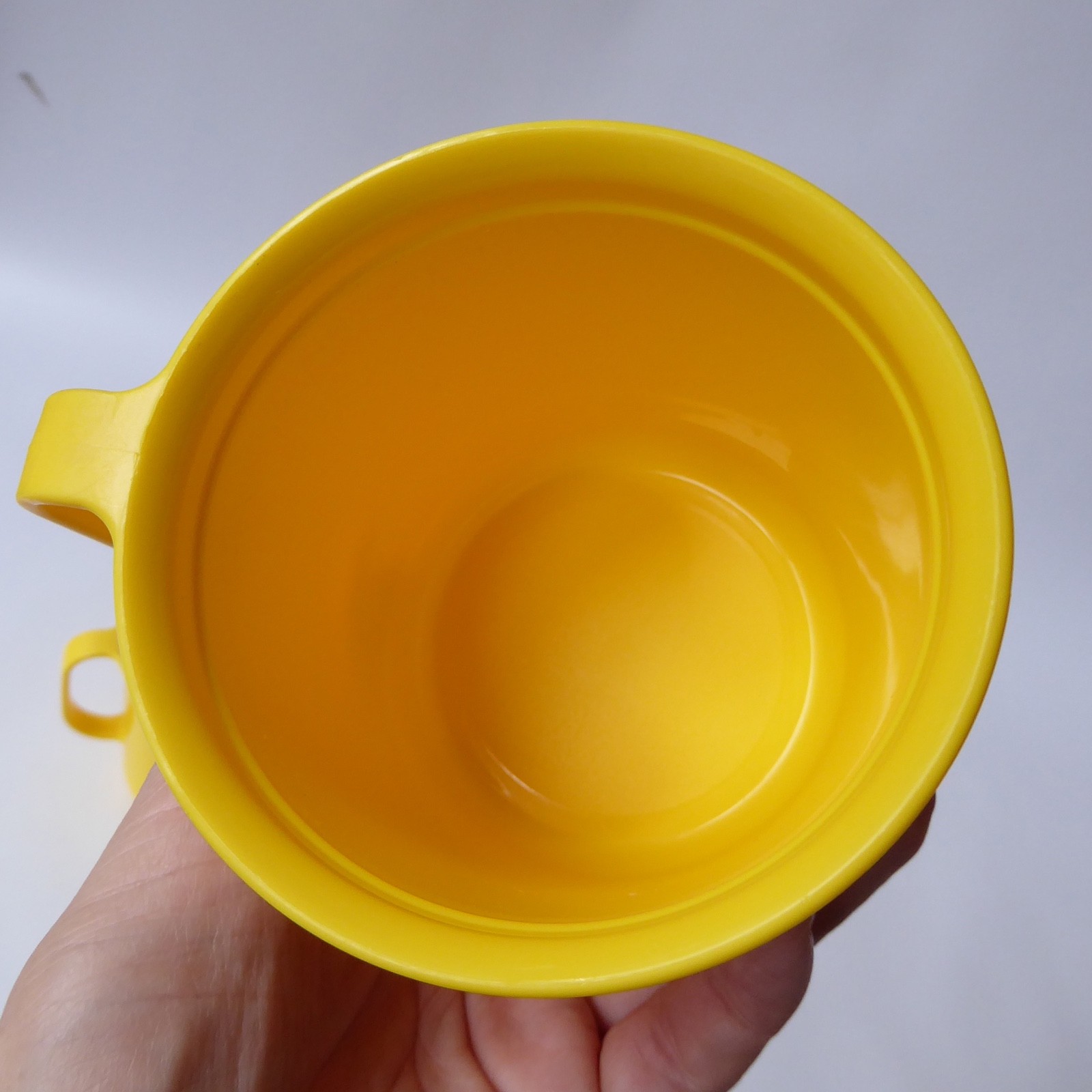A set of three hard-to-find 1980s Tupperware larger bright yellow mugs.