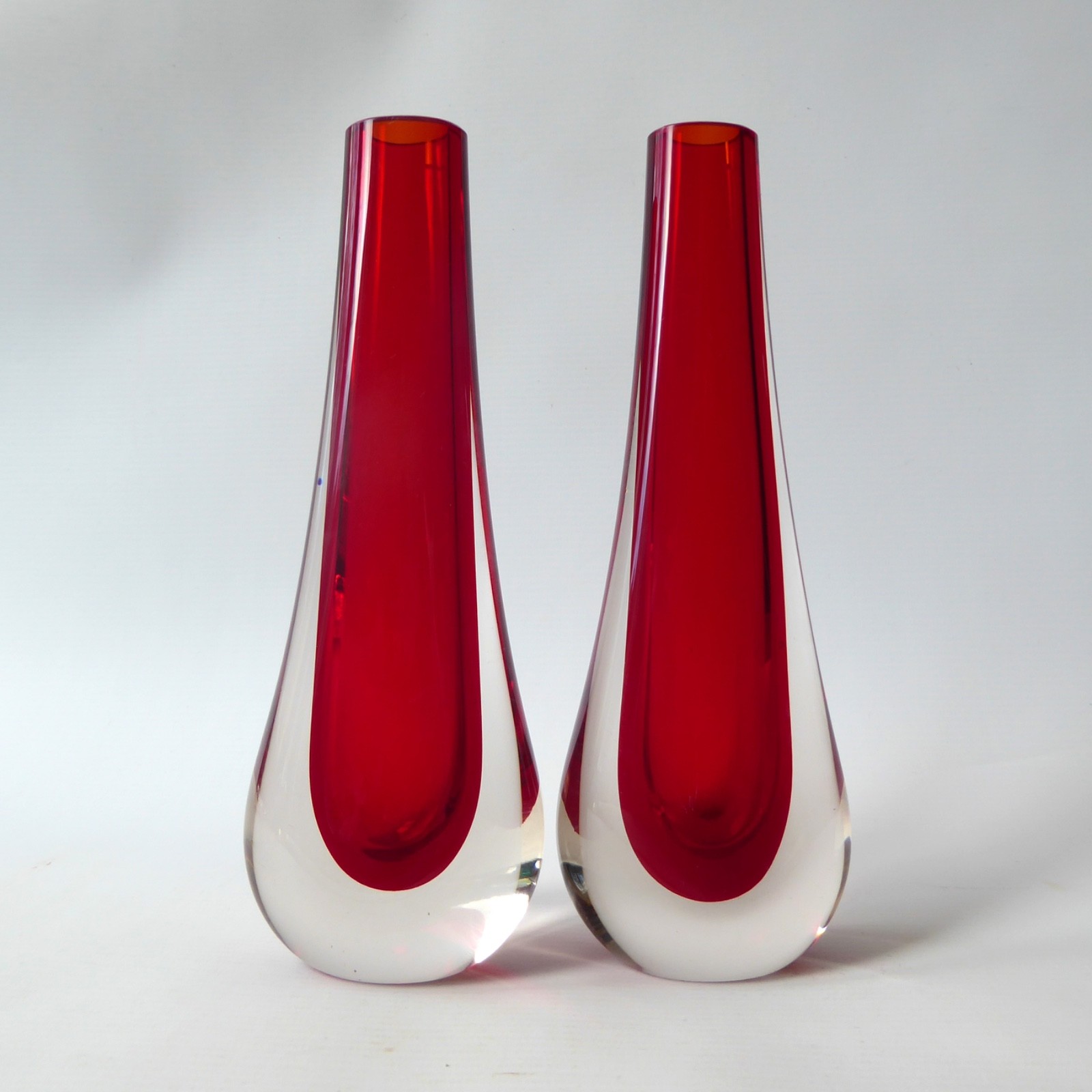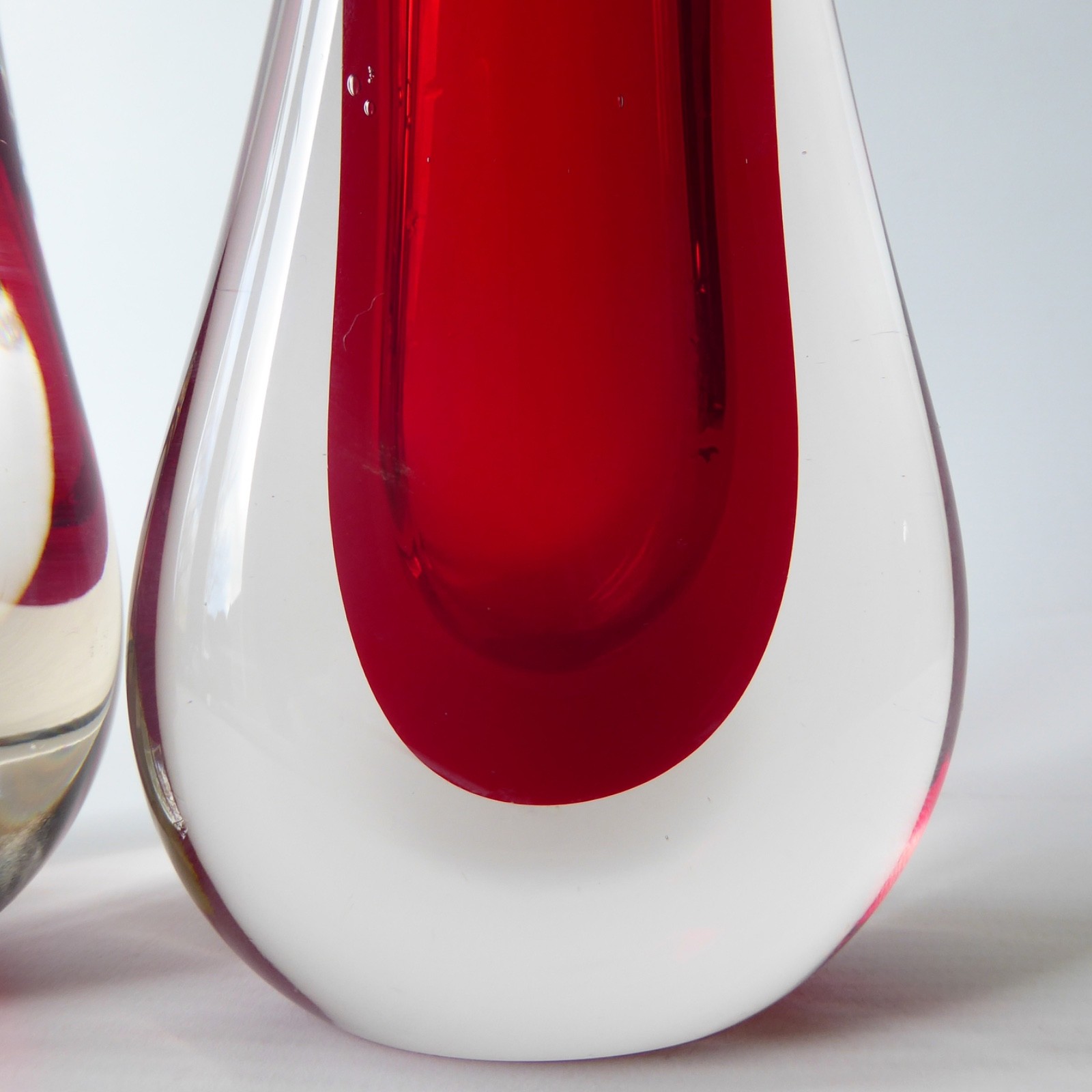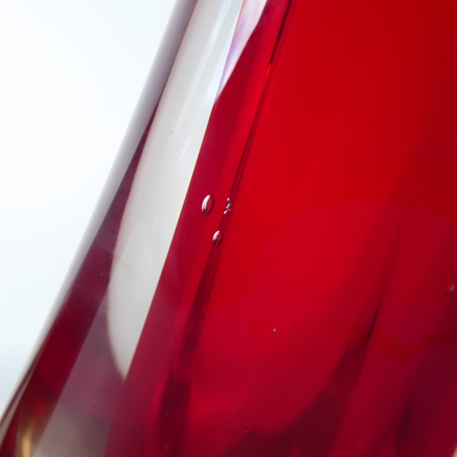 Ruby red, quality thick glass in a tapering teardrop shape, slightly oval and flattened to the centres.