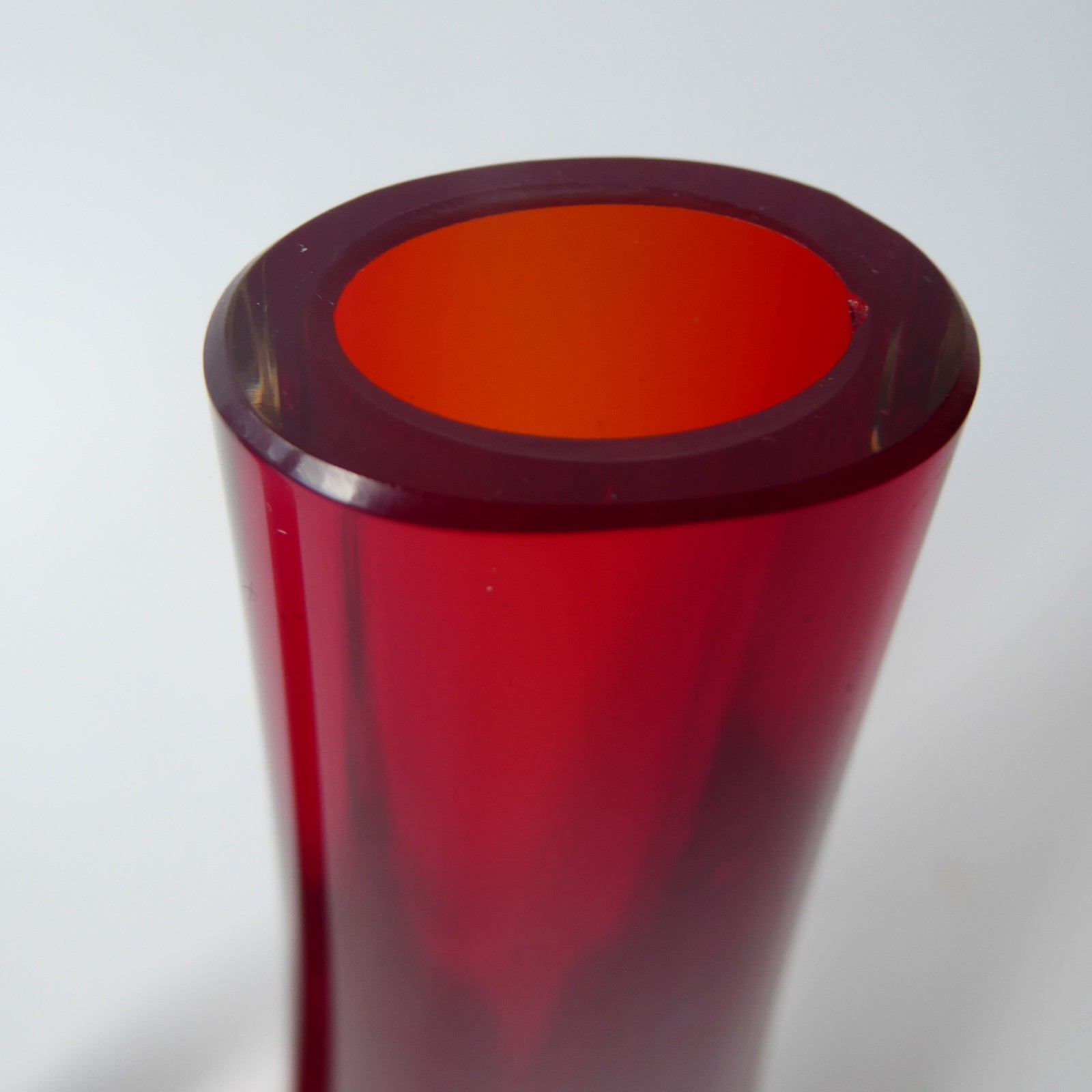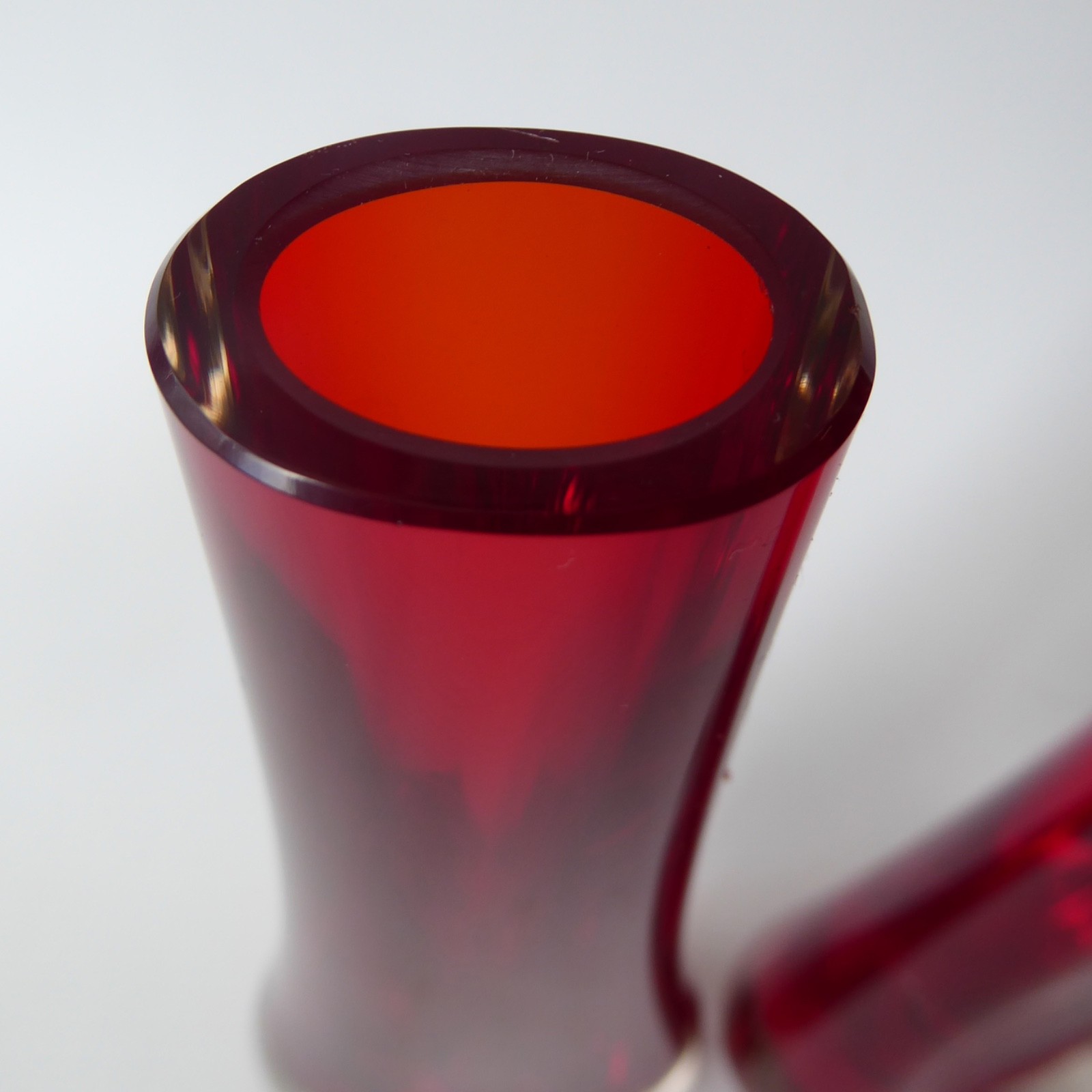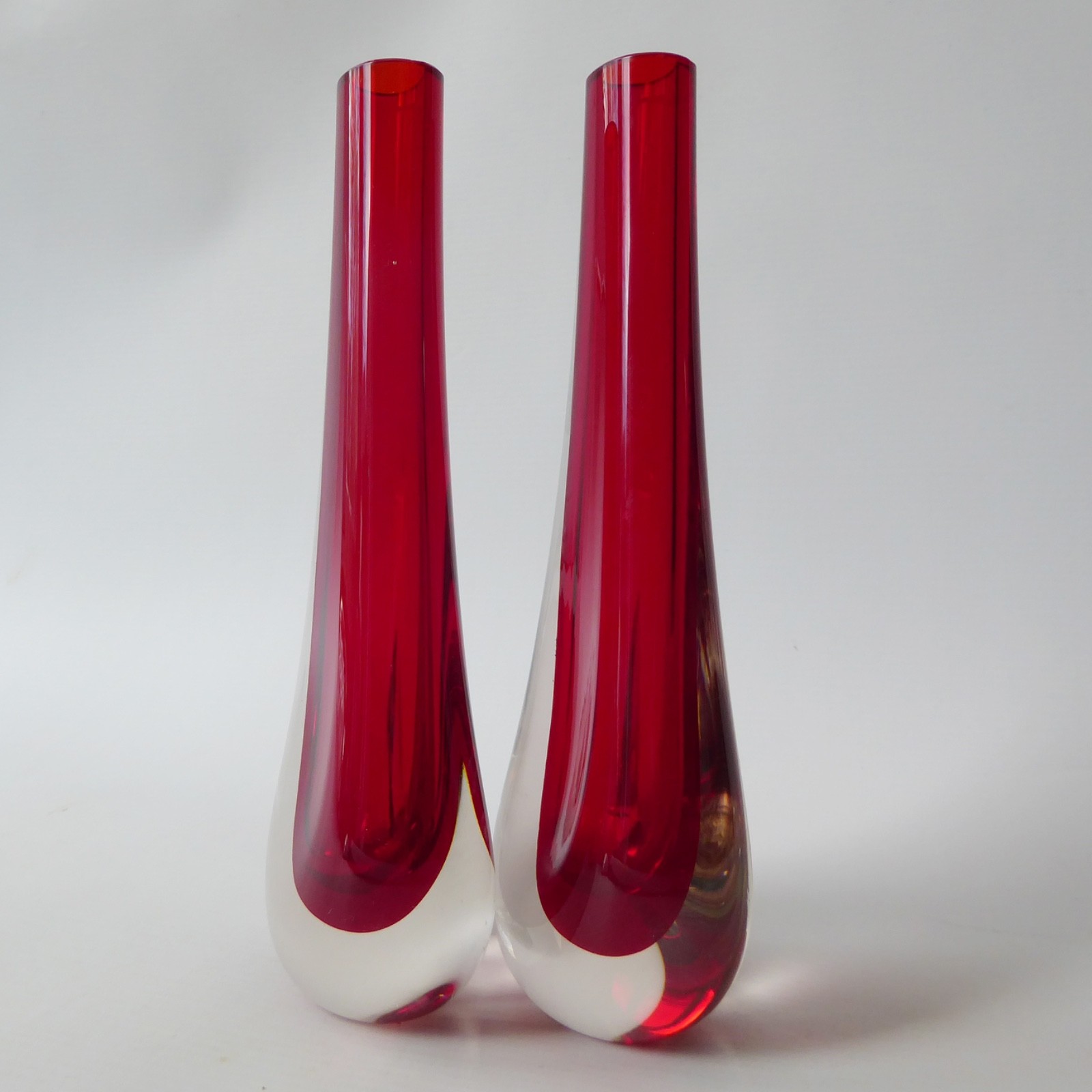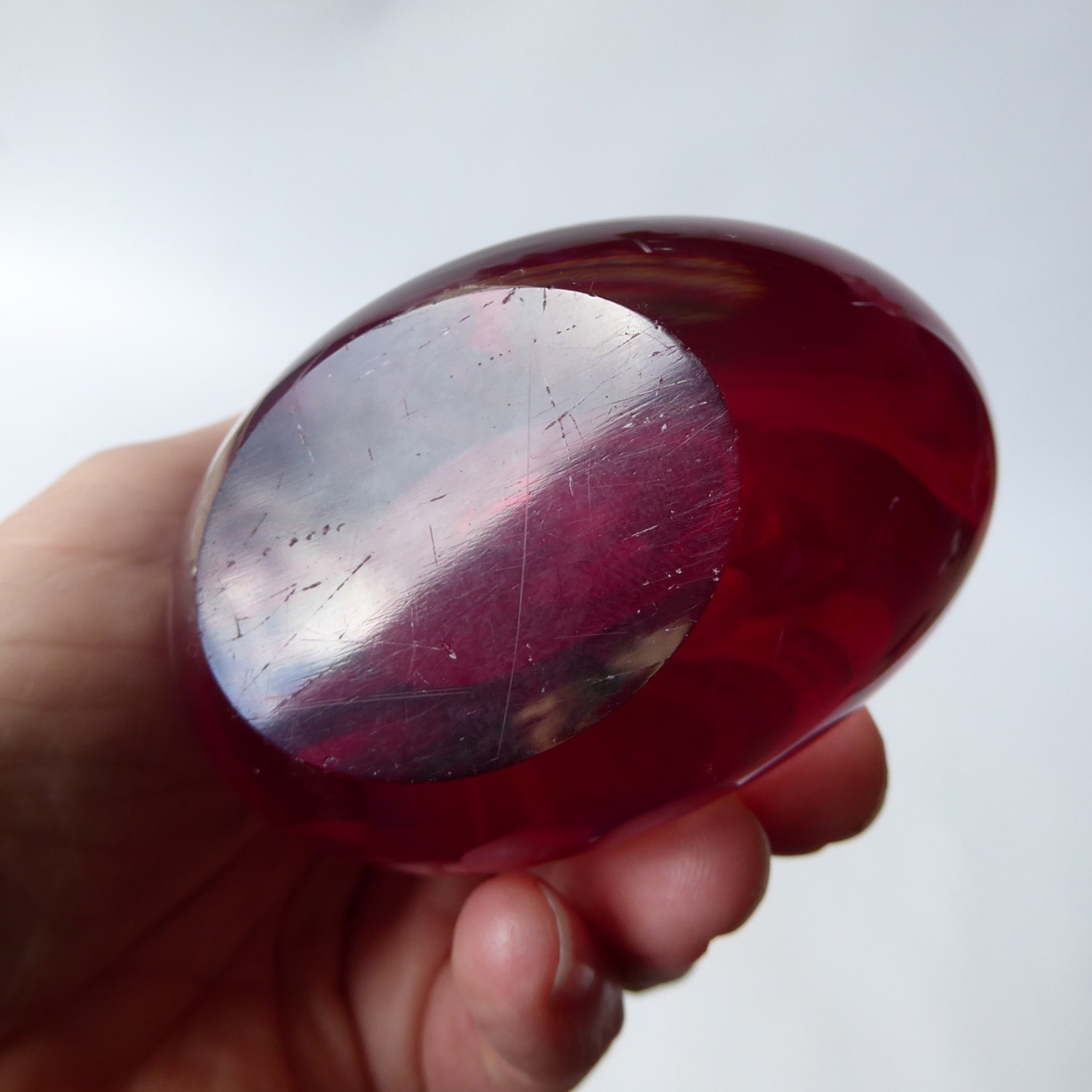 Ruby red, quality thick glass in a tapering teardrop shape, slightly oval and flattened to the centres.