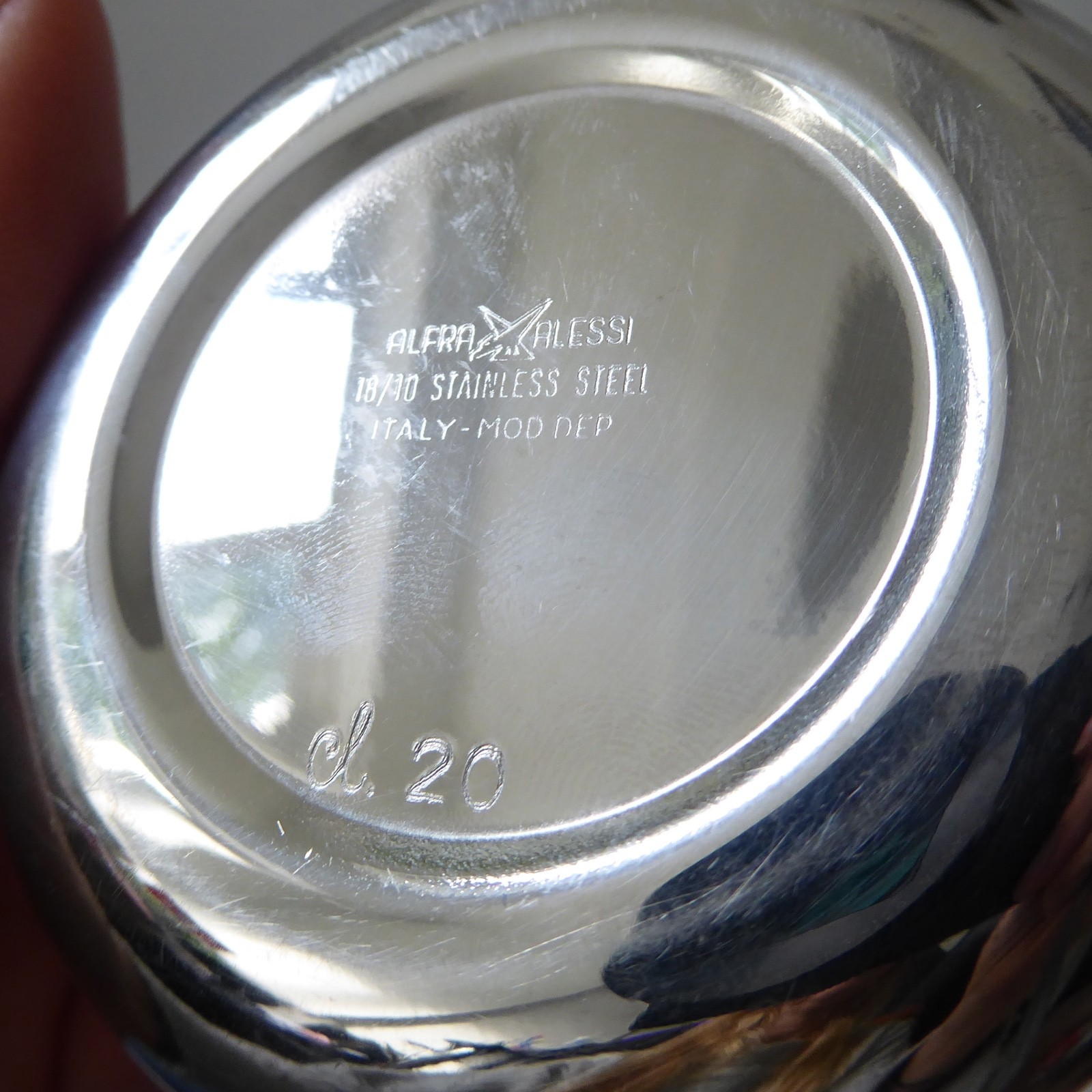18/10 high grade shiny stainless steel. Stamped on the back with ‘Alfra Alessi, 18/10 stainless steel. Italy, Mod. Dep.’ with the bird logo. The Alfra Alessi logo means it dates from pre 1967, before the company became just ALESSI.
