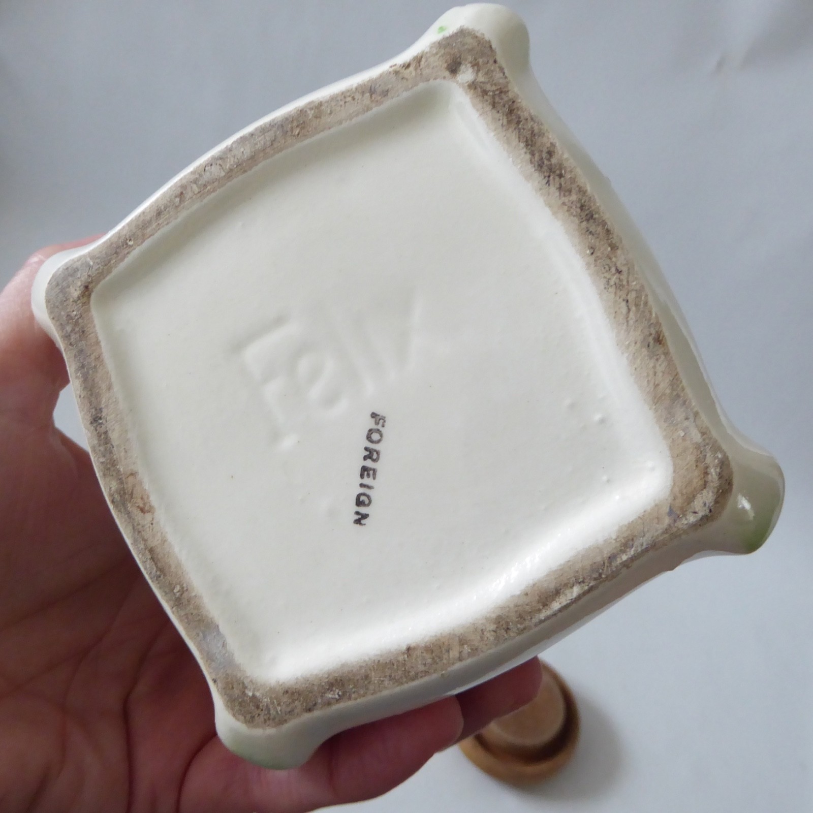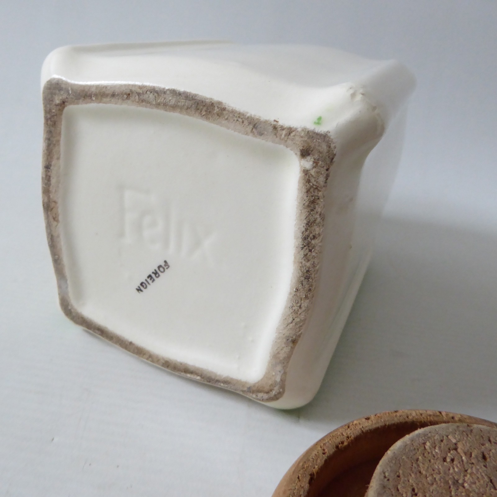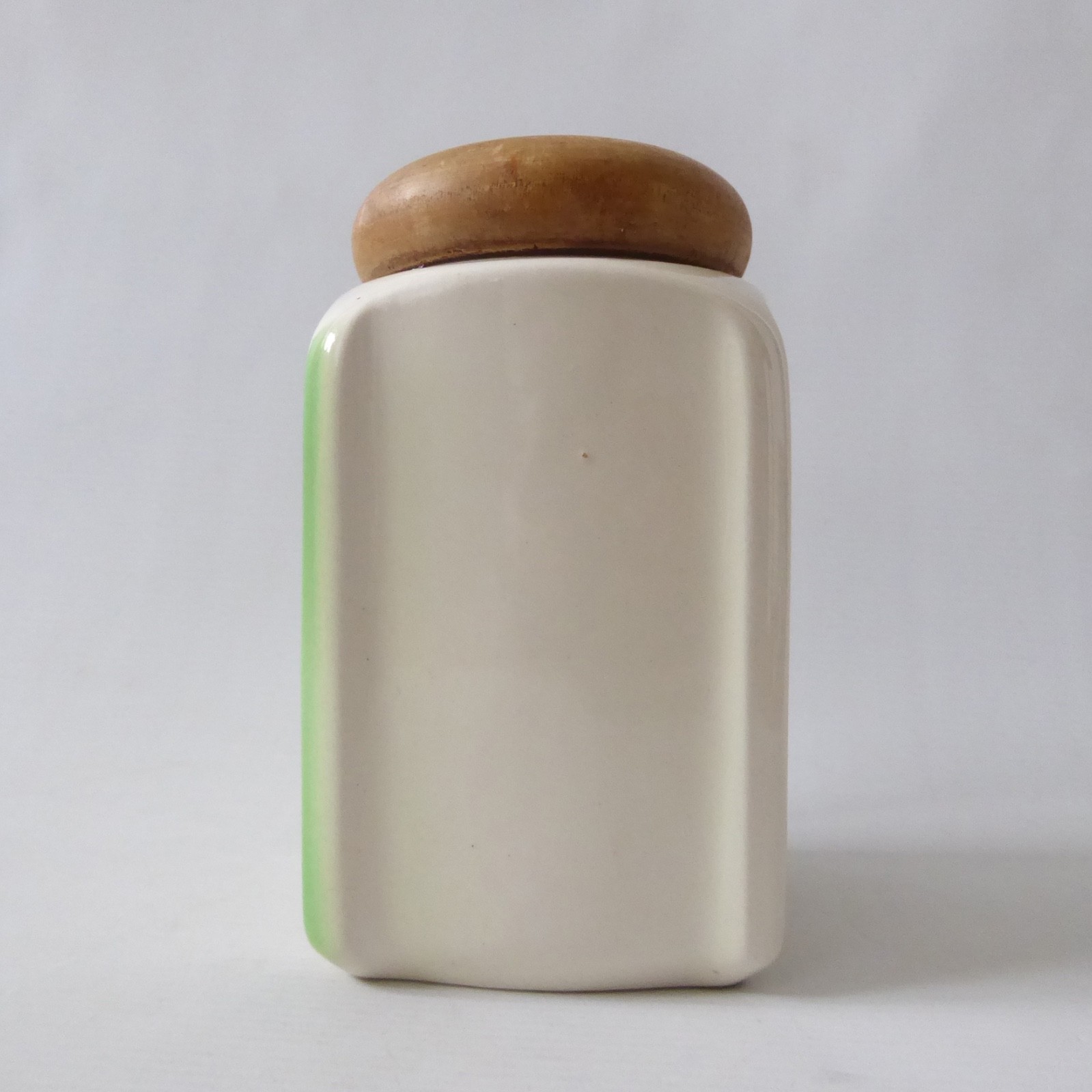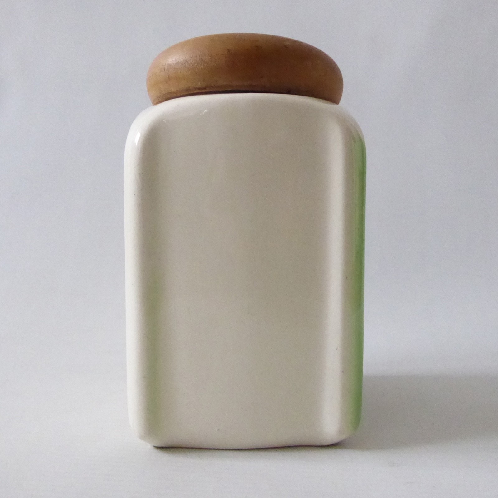 Cream glazed ceramic with green stylised decor to one side.