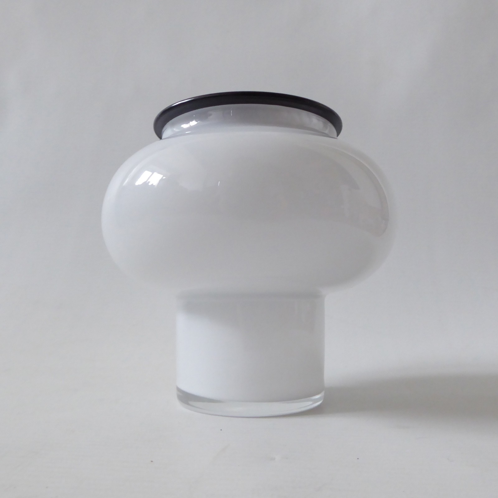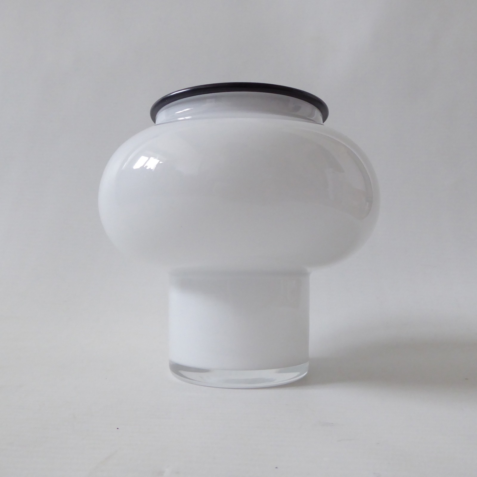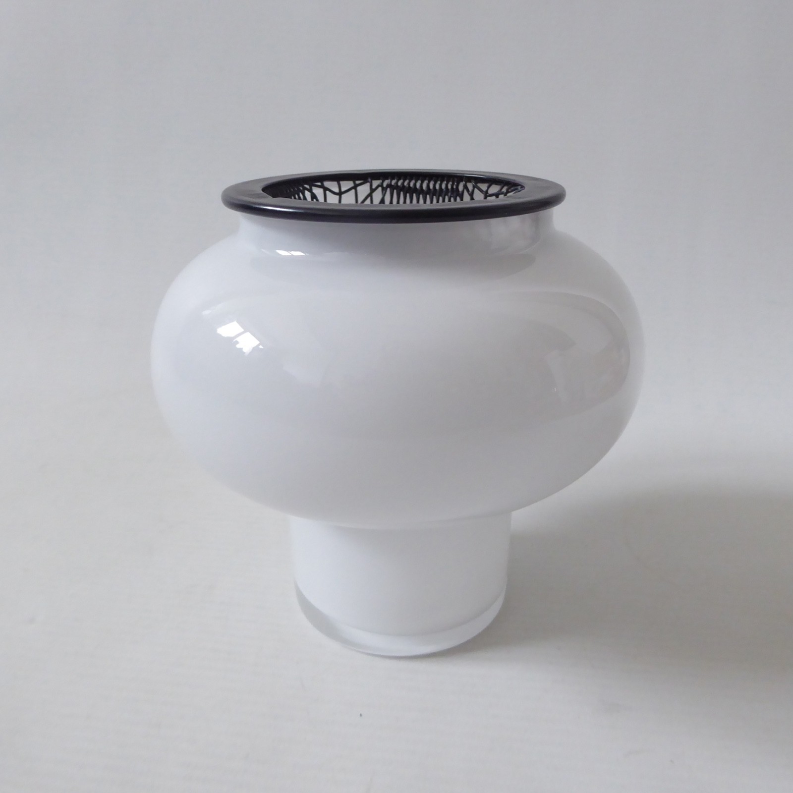 Opal white art glass, cased in clear with cylinder foot and bulbous hooped upper.