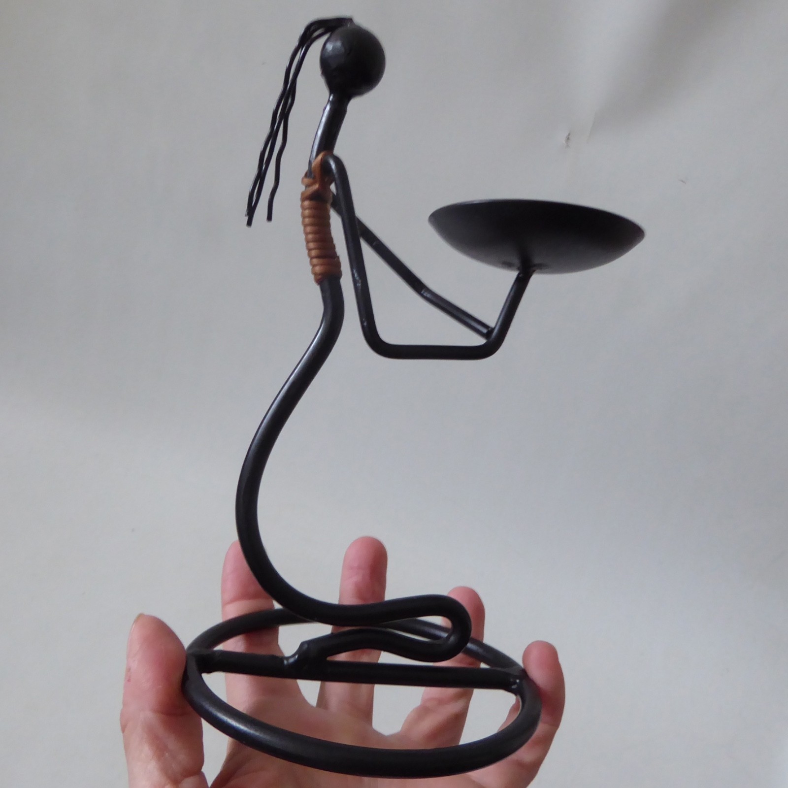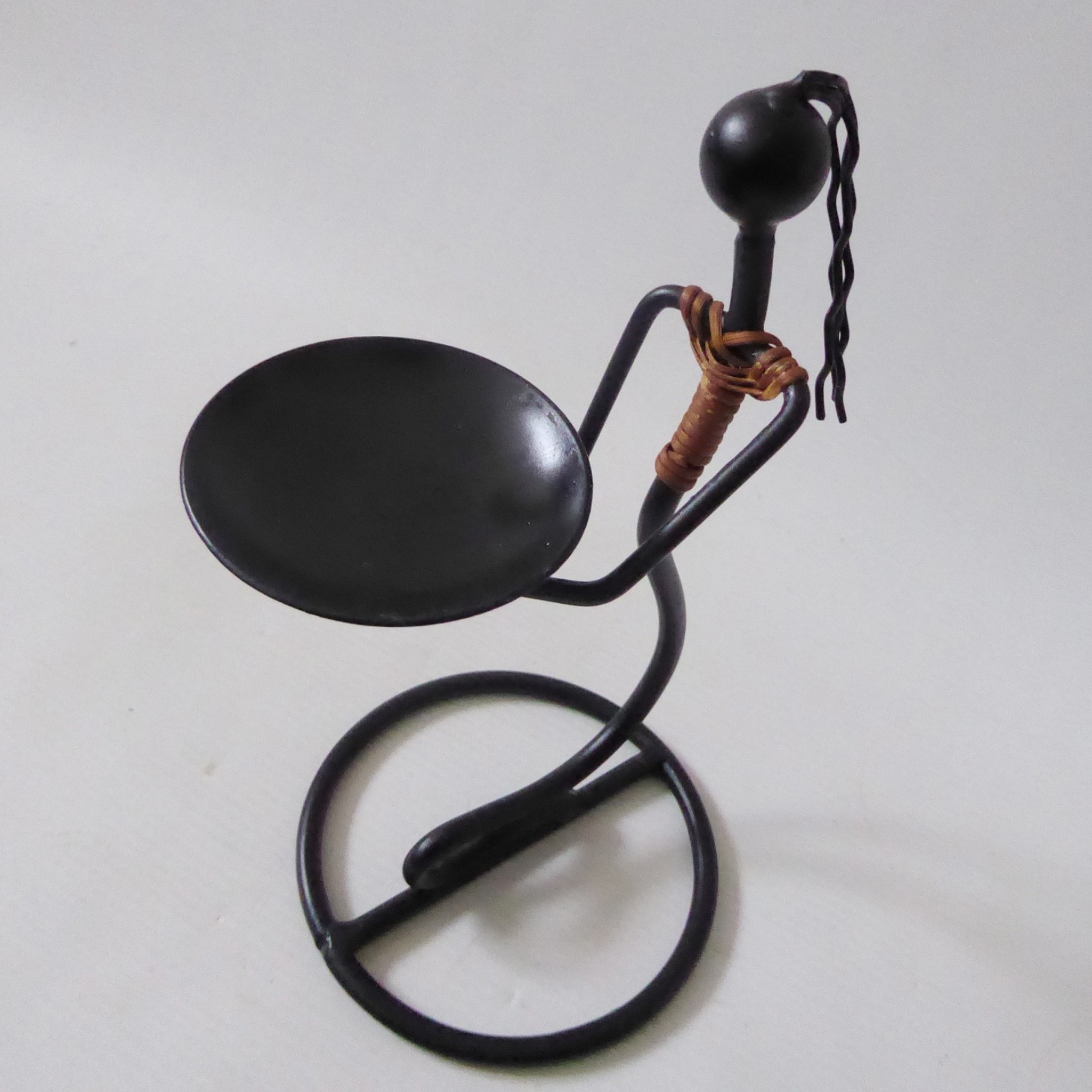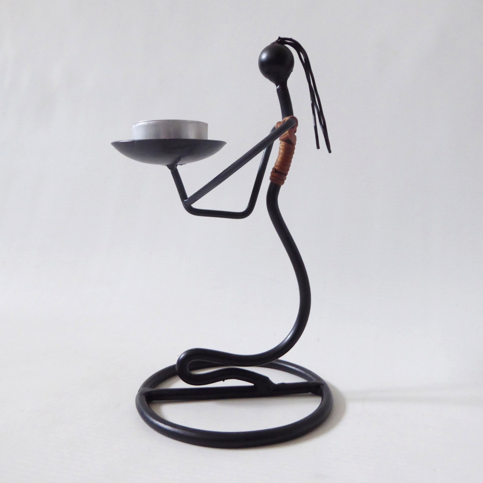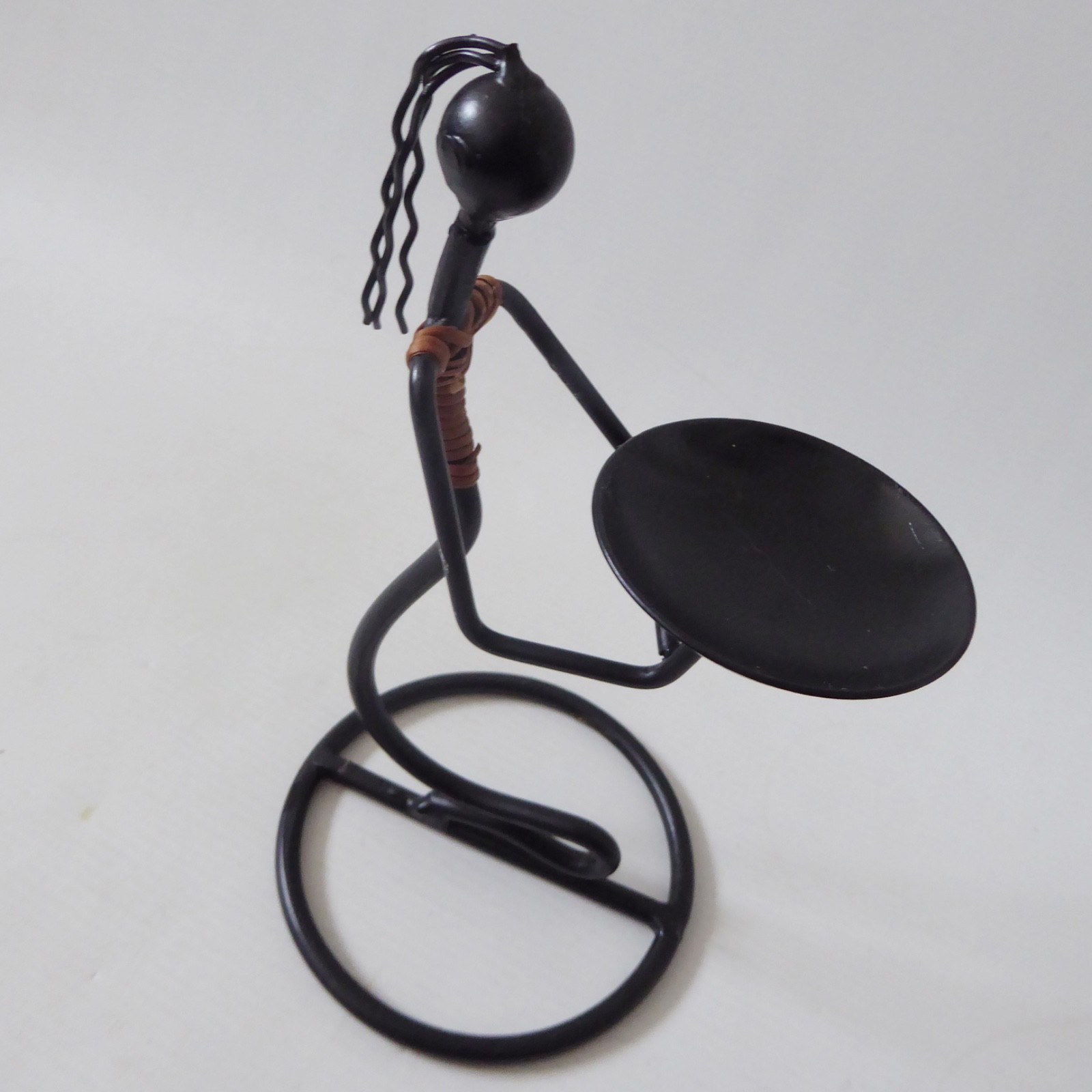 surface to hold candle, female figure, stylised, black metal, twine, cane