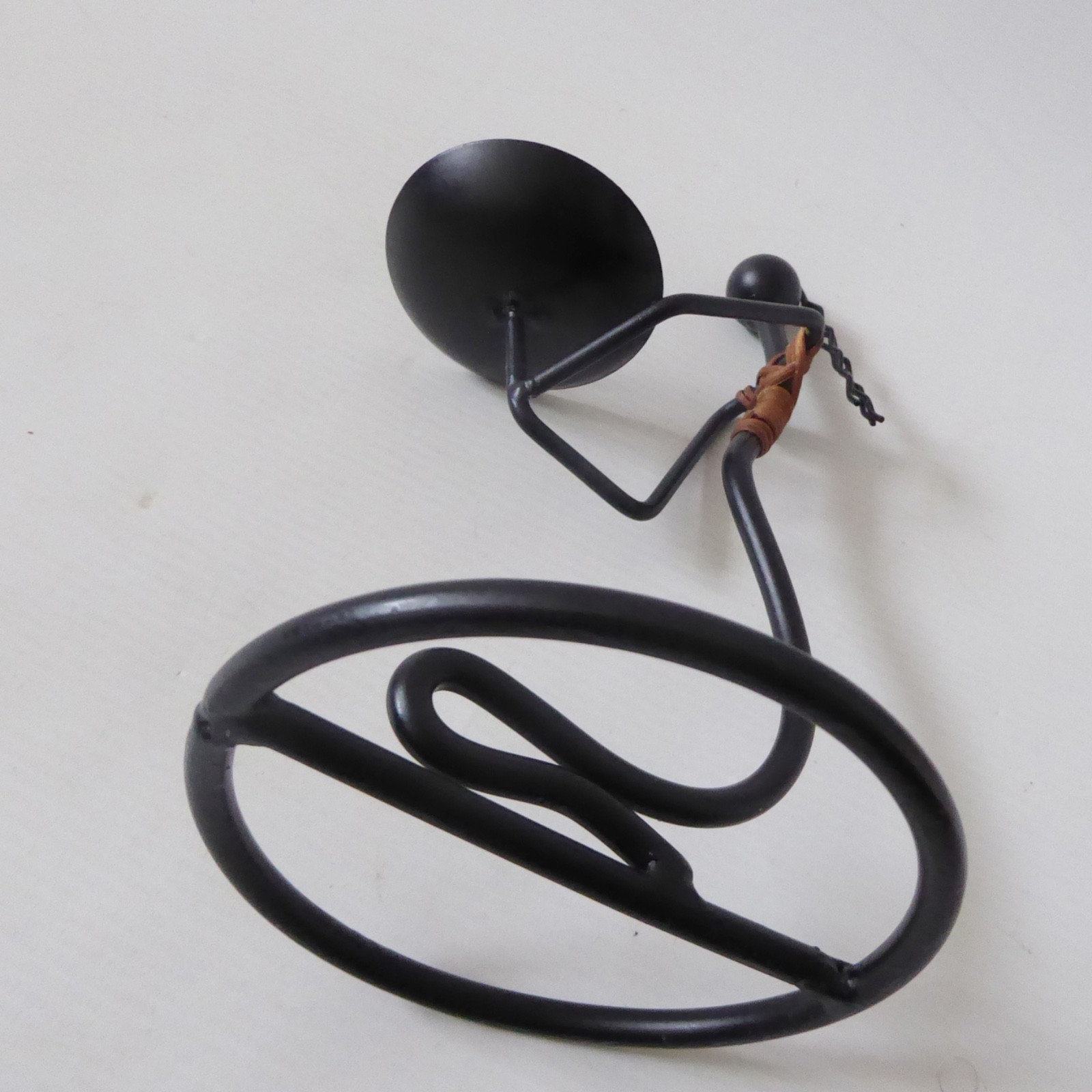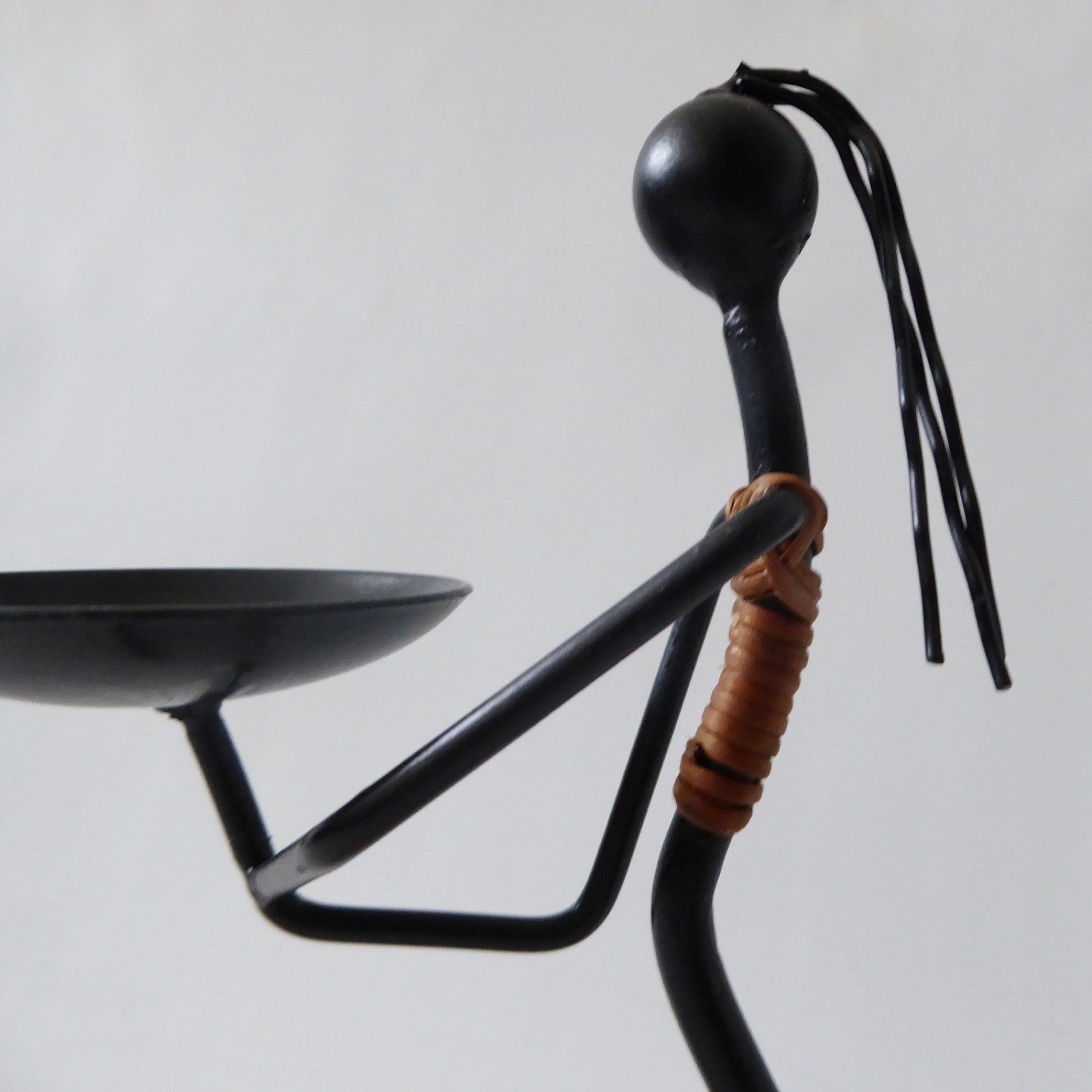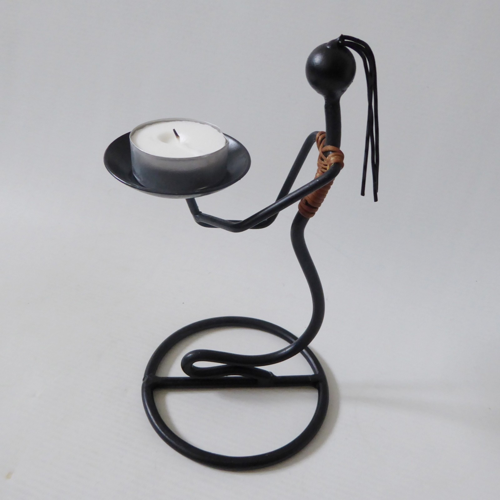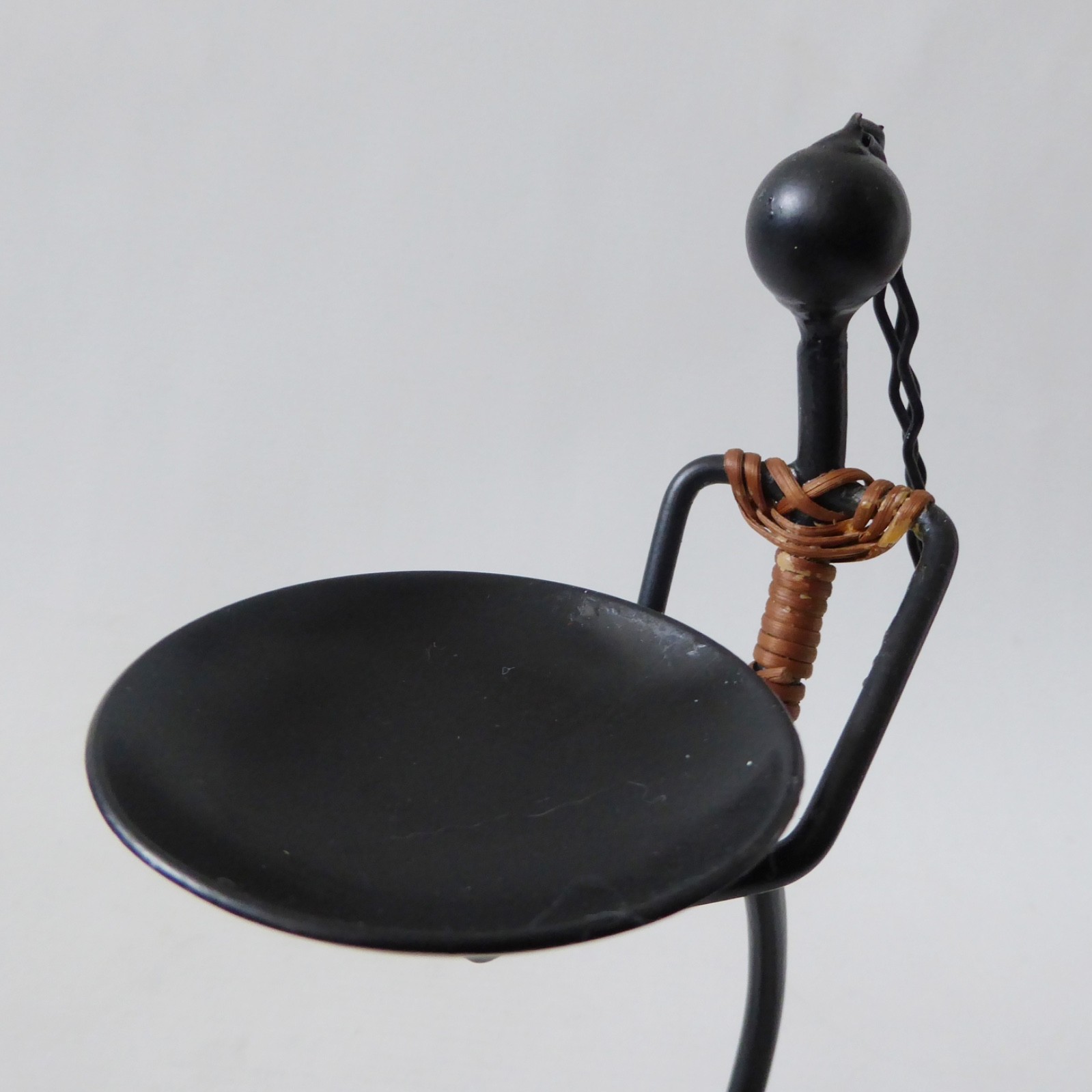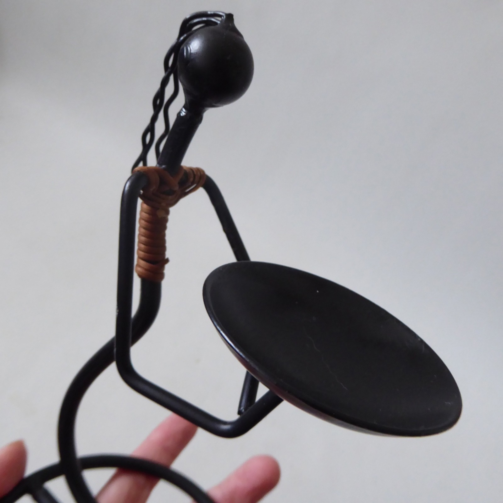 surface to hold candle, female figure, stylised, black metal, twine, cane