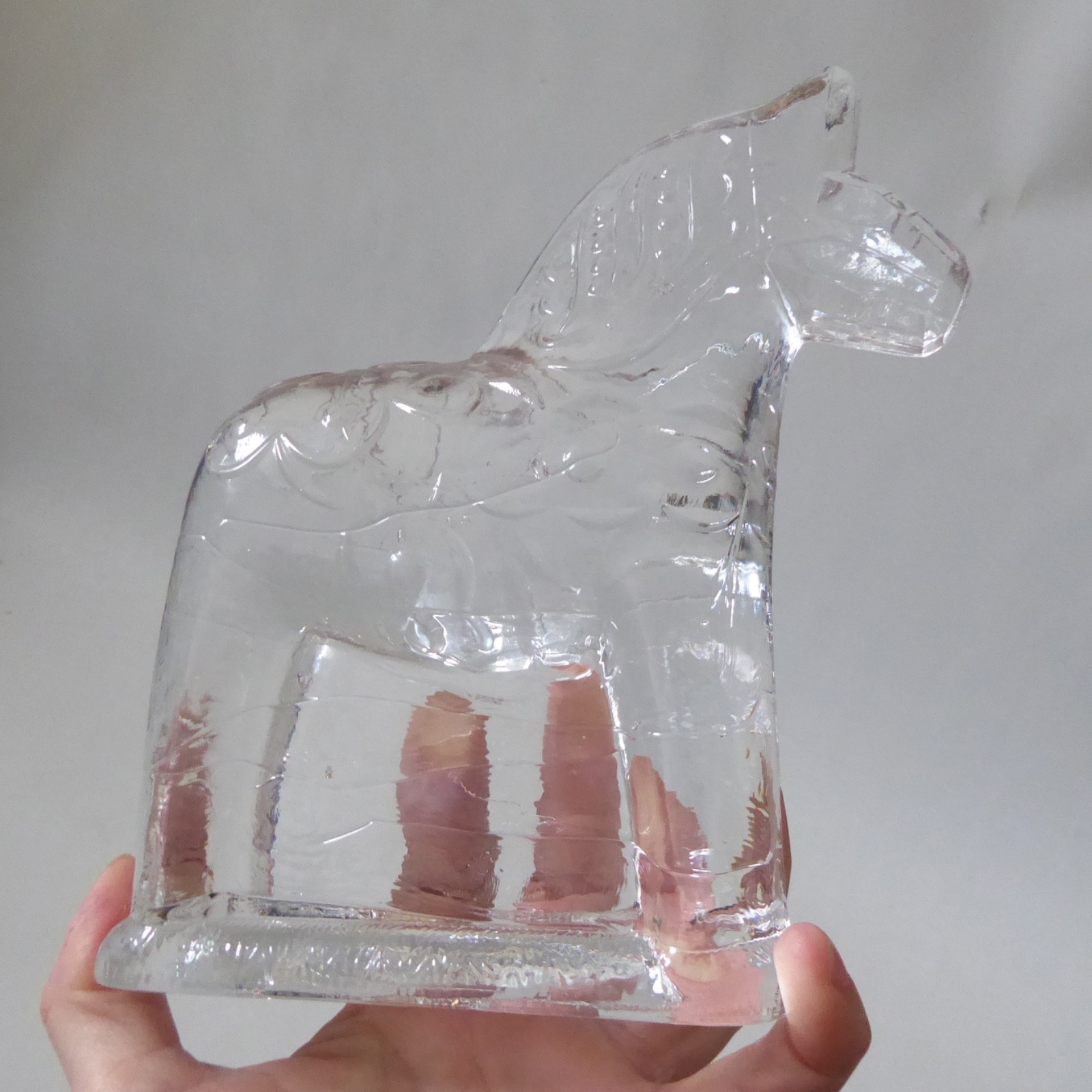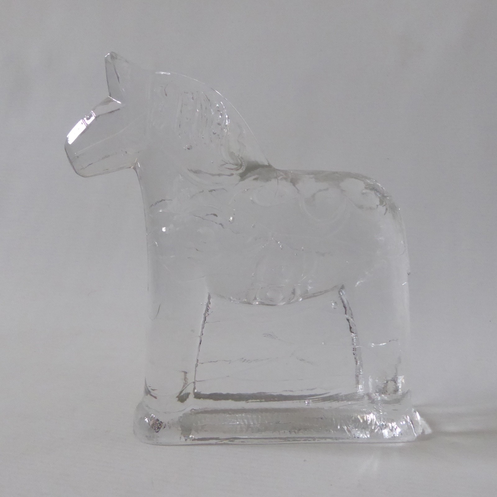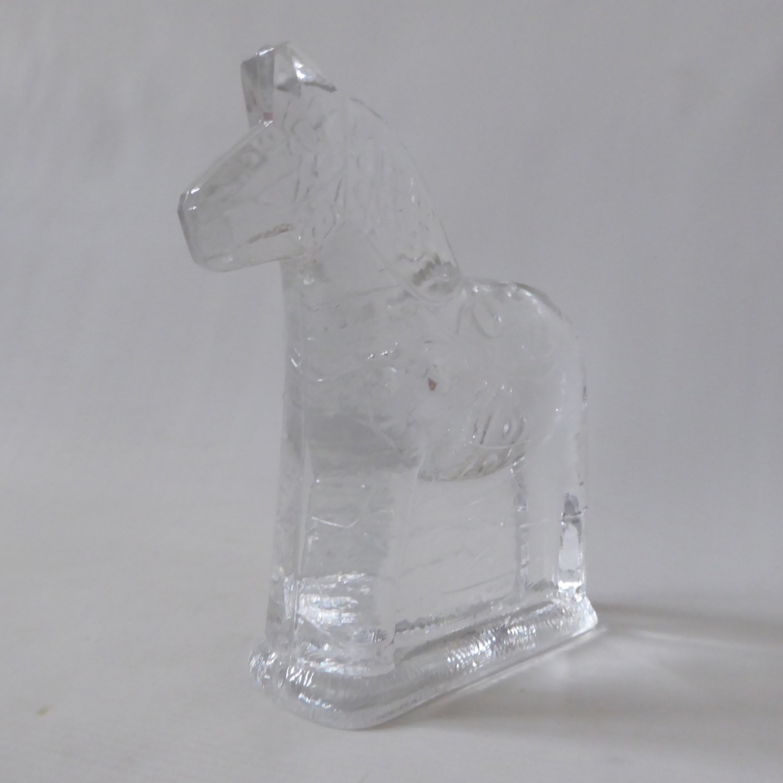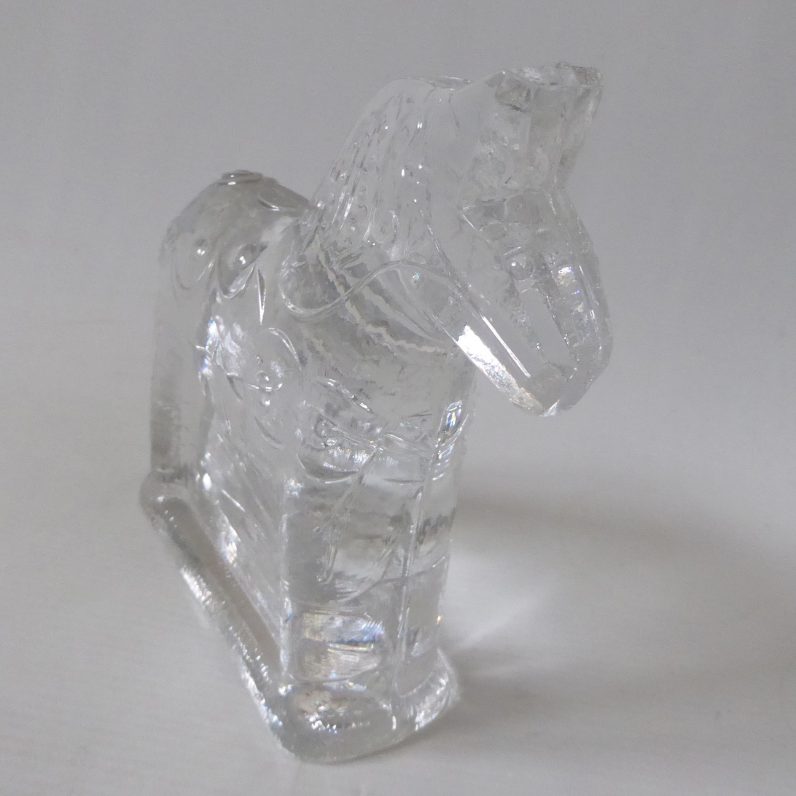 This is a clear solid glass Dala horse figurine with more detail than the smaller figurines, including mane and patterns.