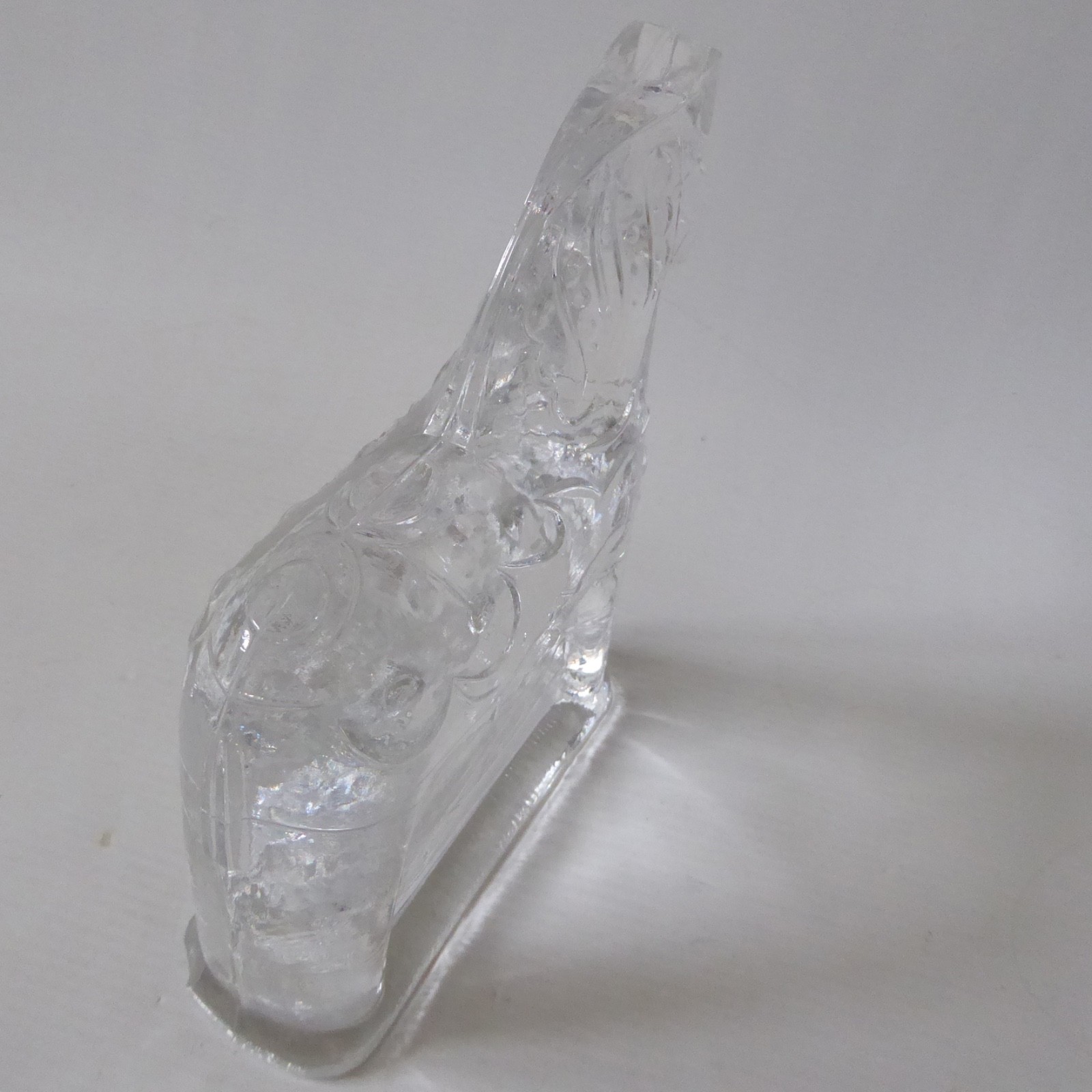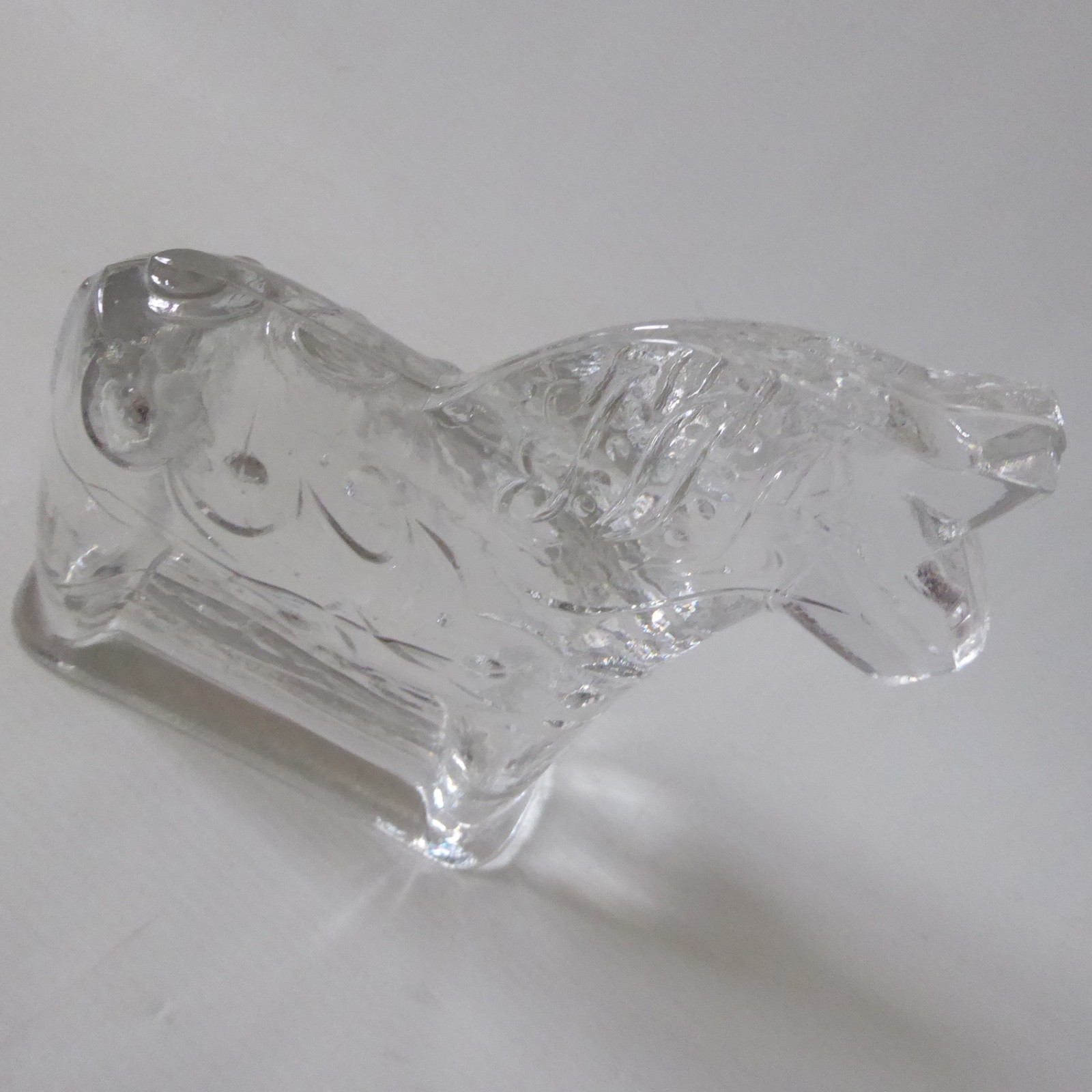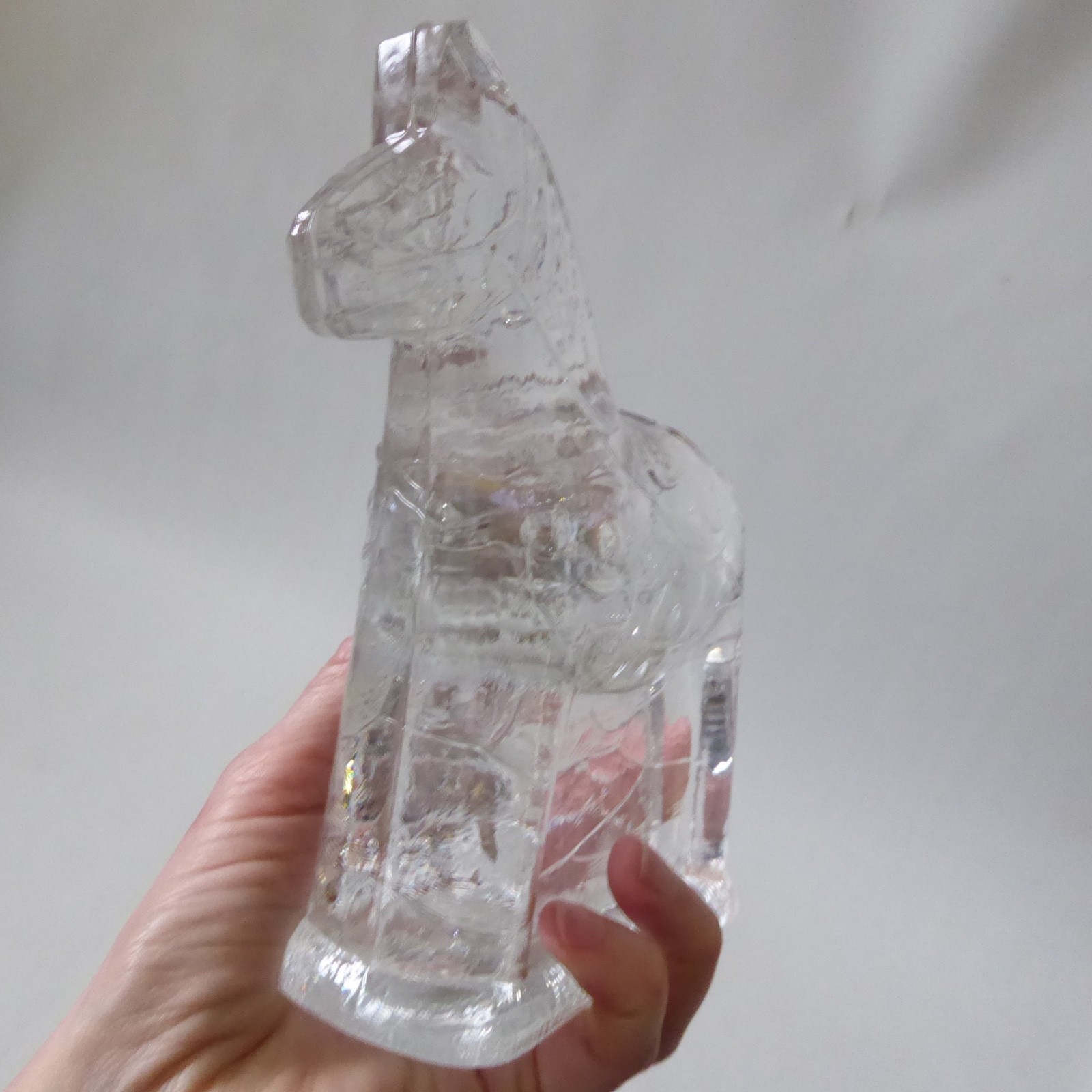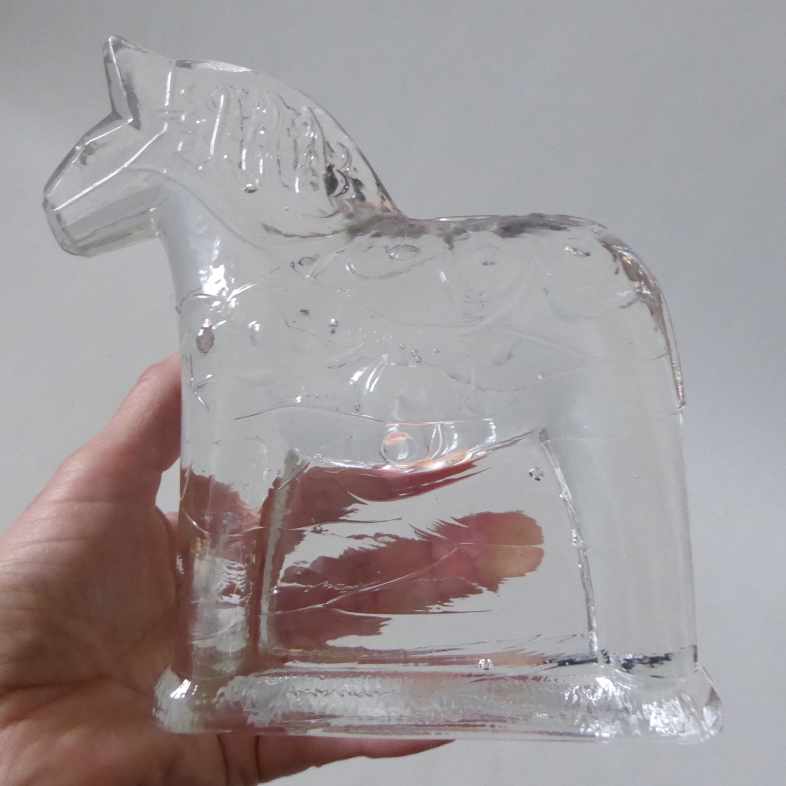 This is a clear solid glass Dala horse figurine with more detail than the smaller figurines, including mane and patterns.
