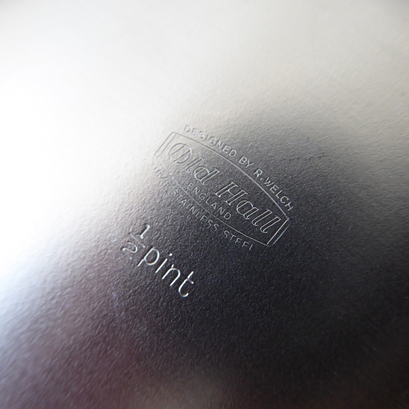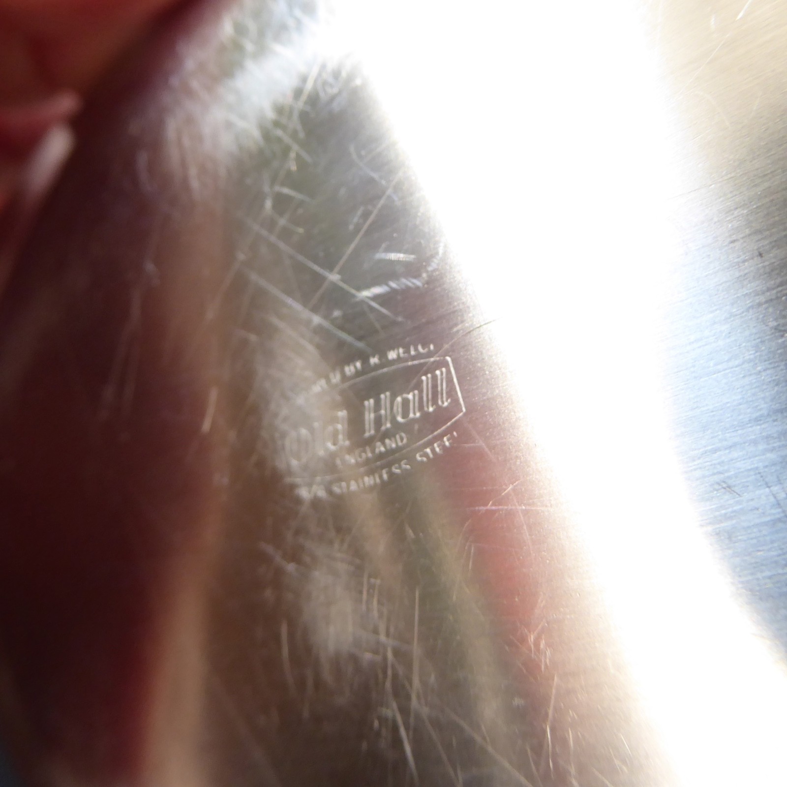 Stamped on both bases with the Old Hall logo and “Designed by R Welch, Old Hall England, 18/8 Stainless Steel”.