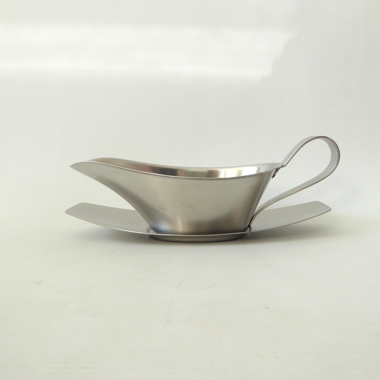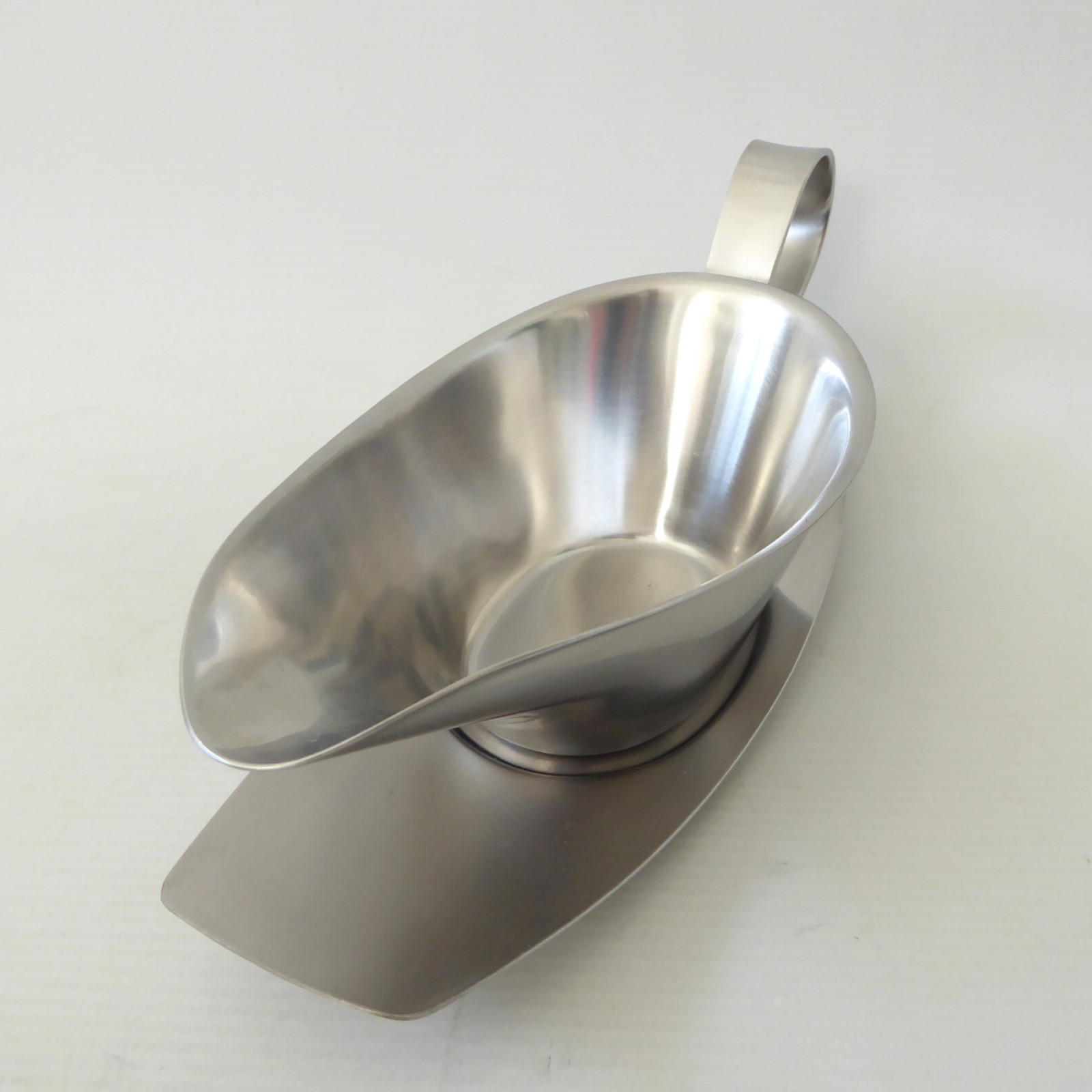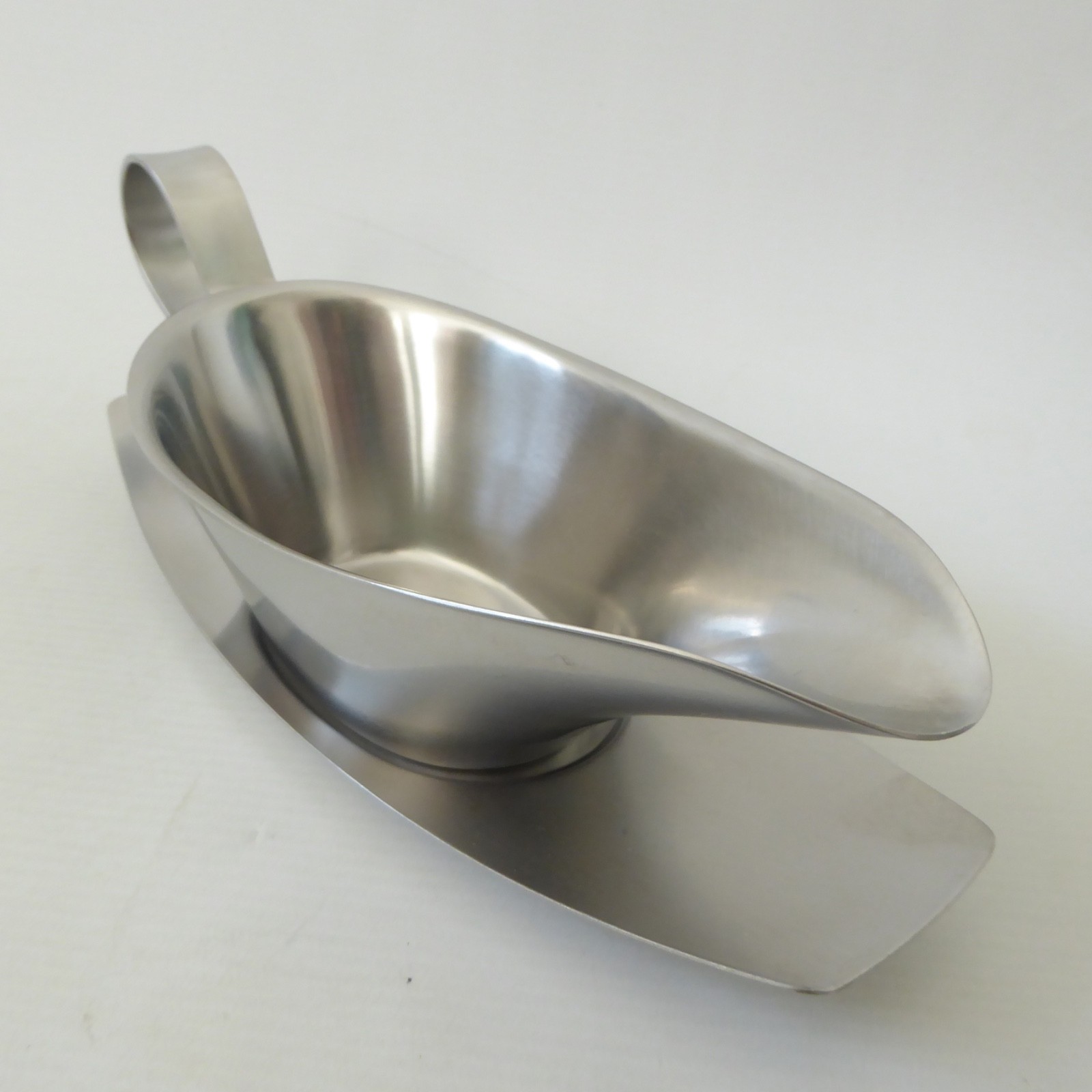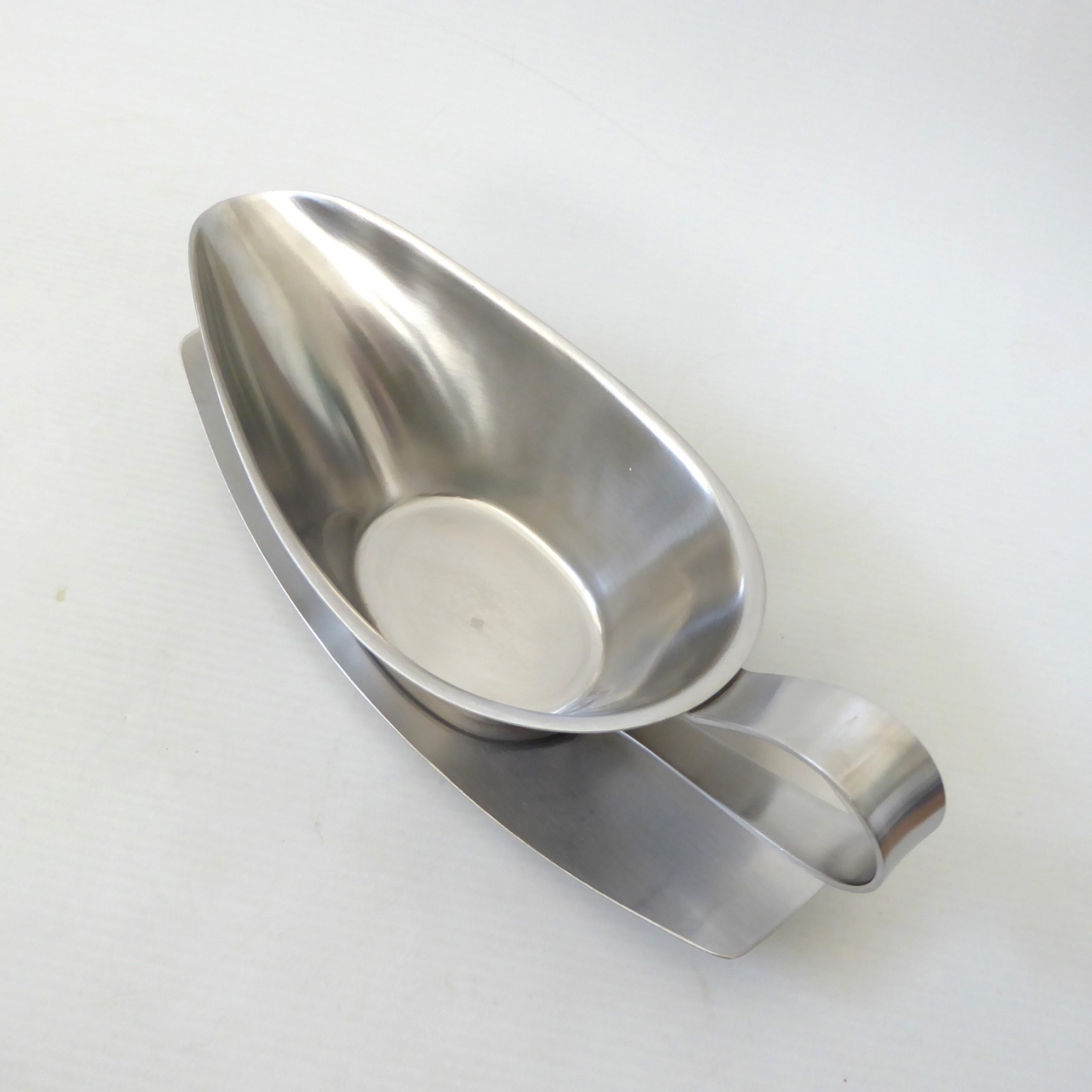 This satin finish stainless steel sauce boat comes with its matching separate drip tray.