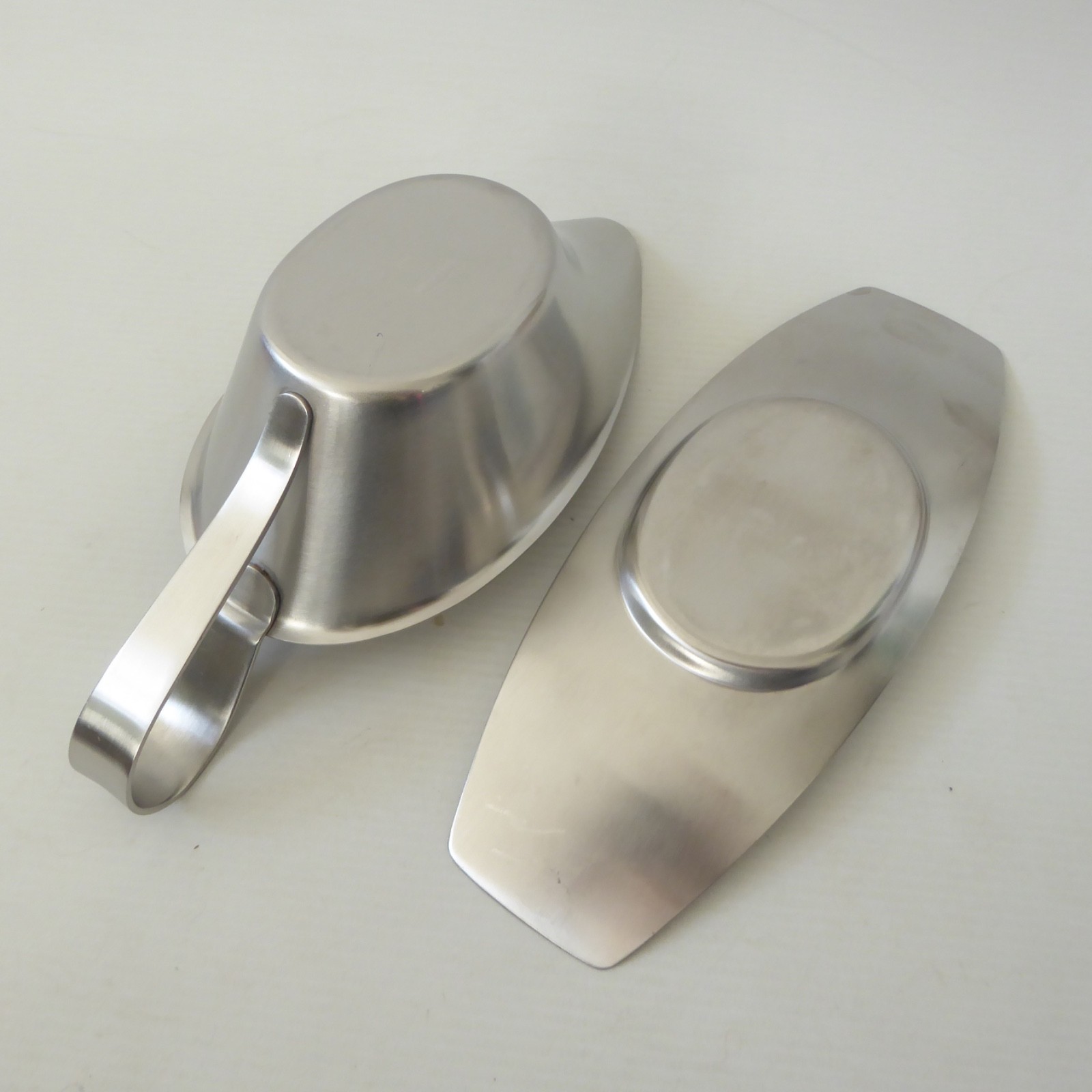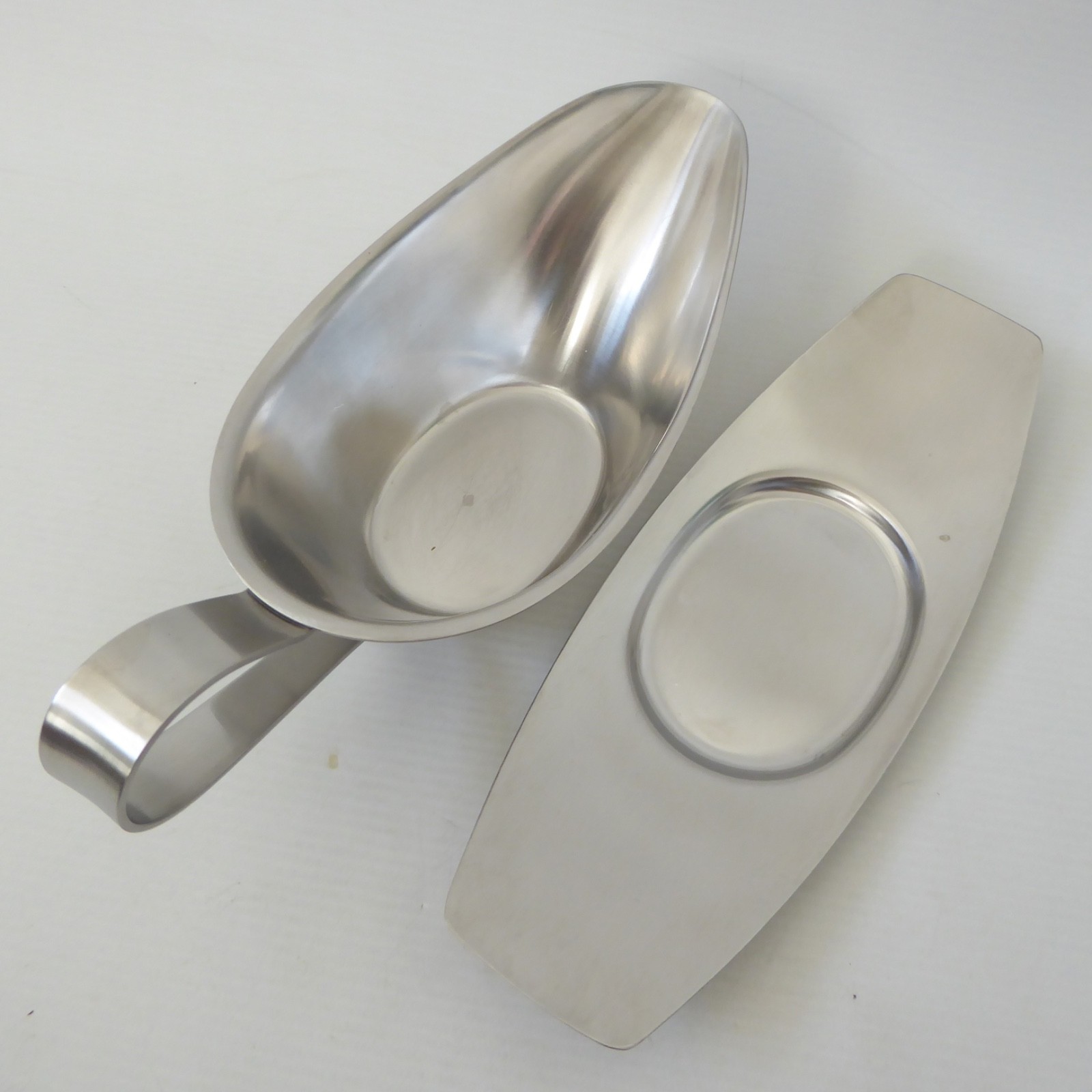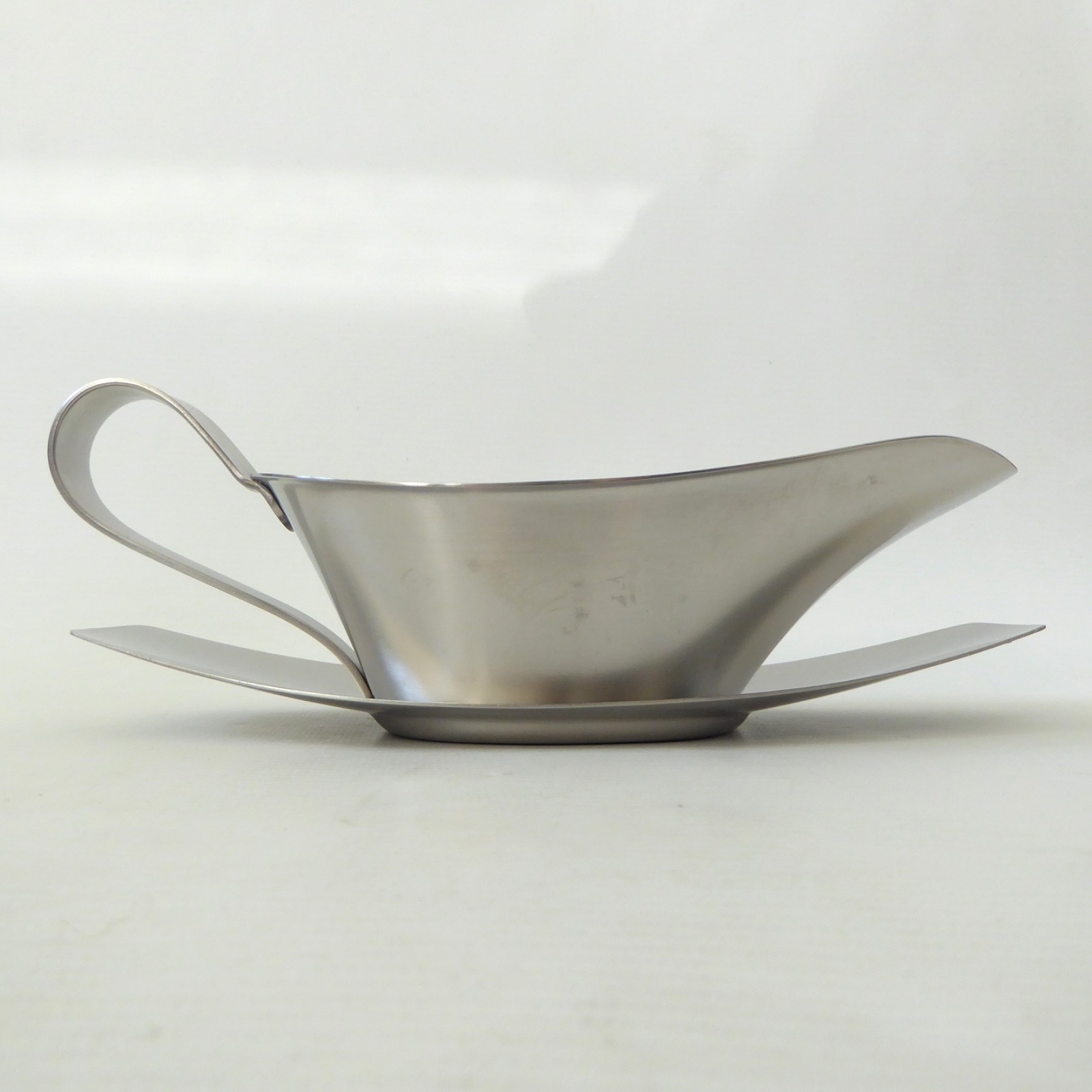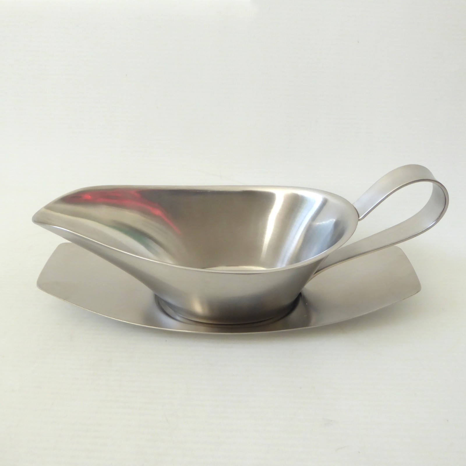 This satin finish stainless steel sauce boat comes with its matching separate drip tray.