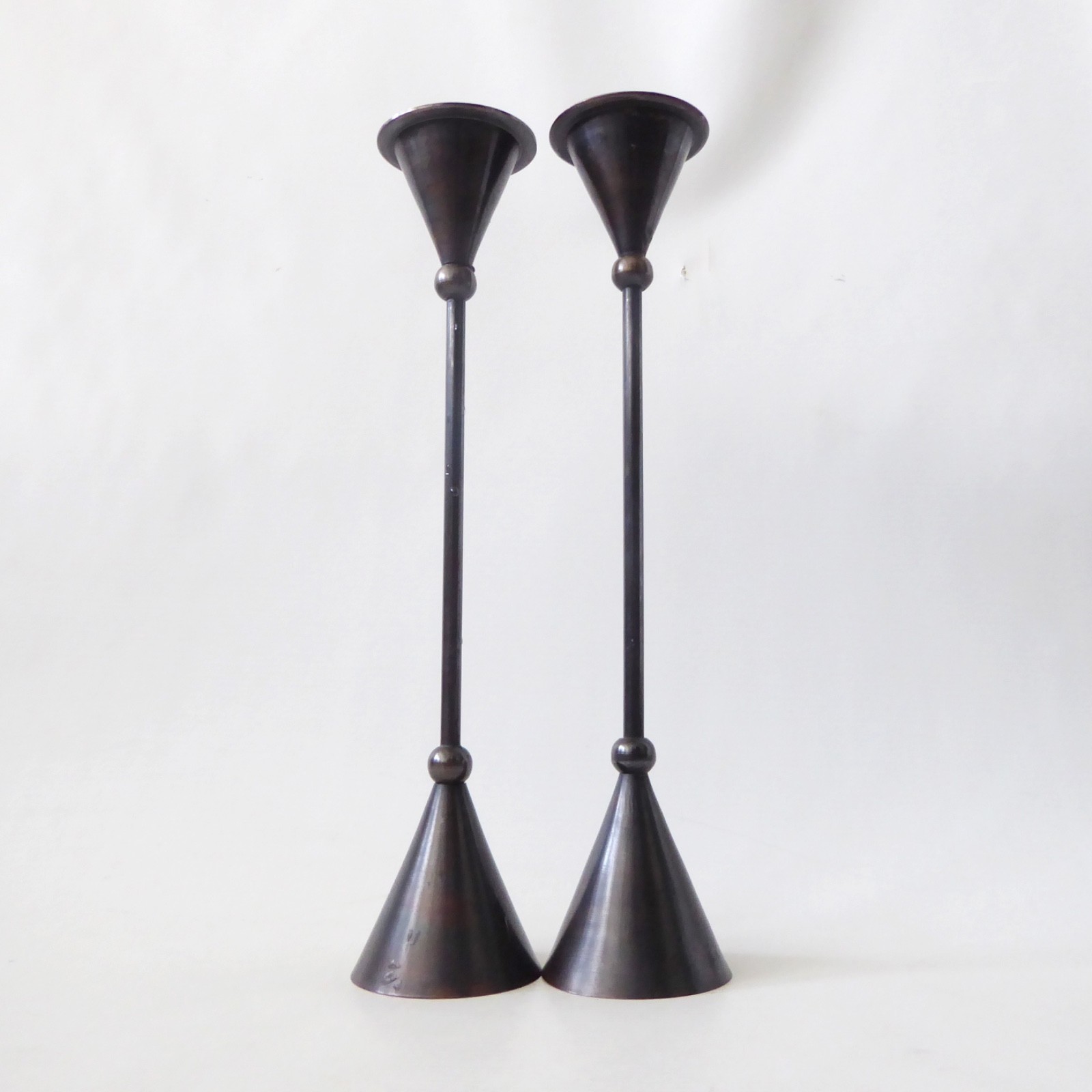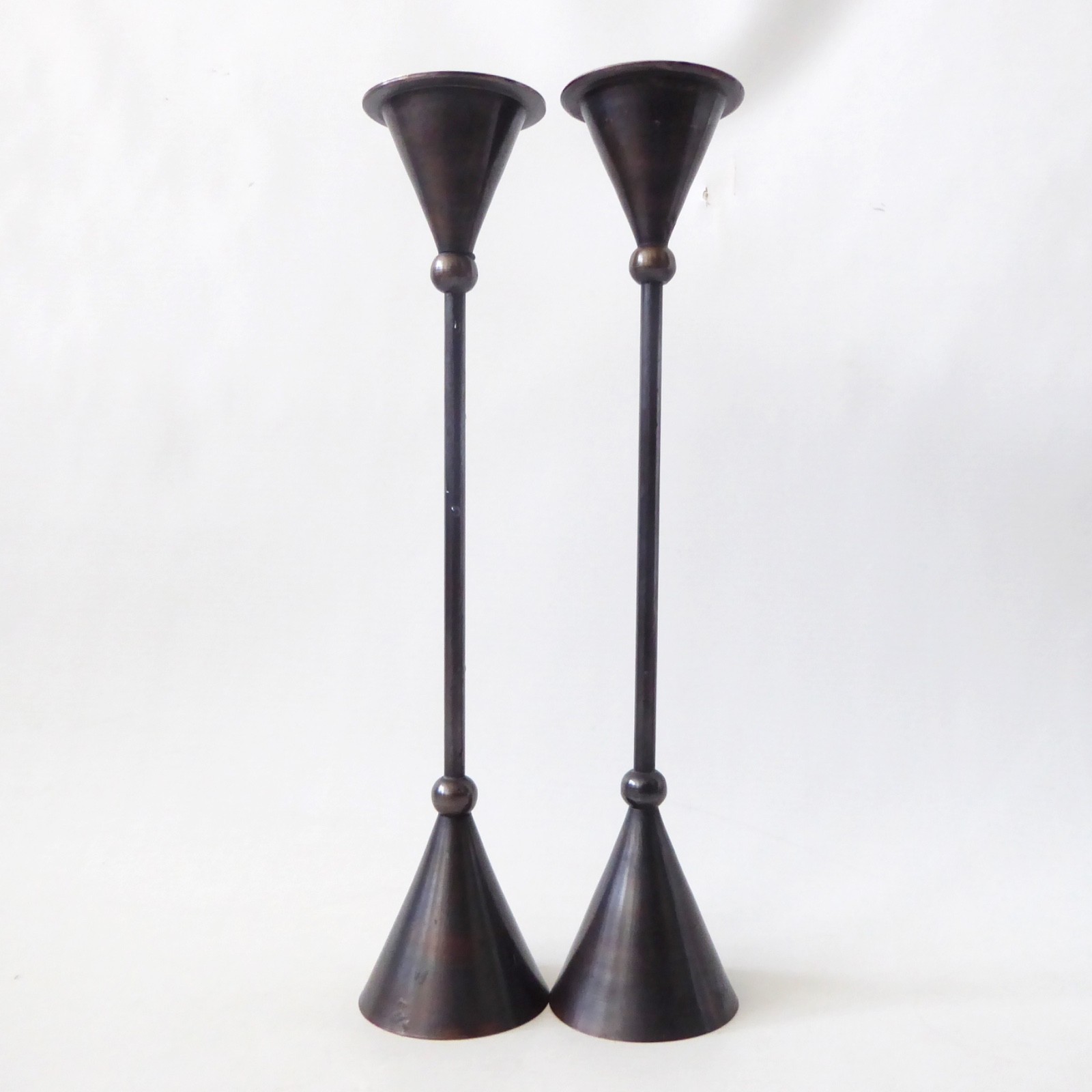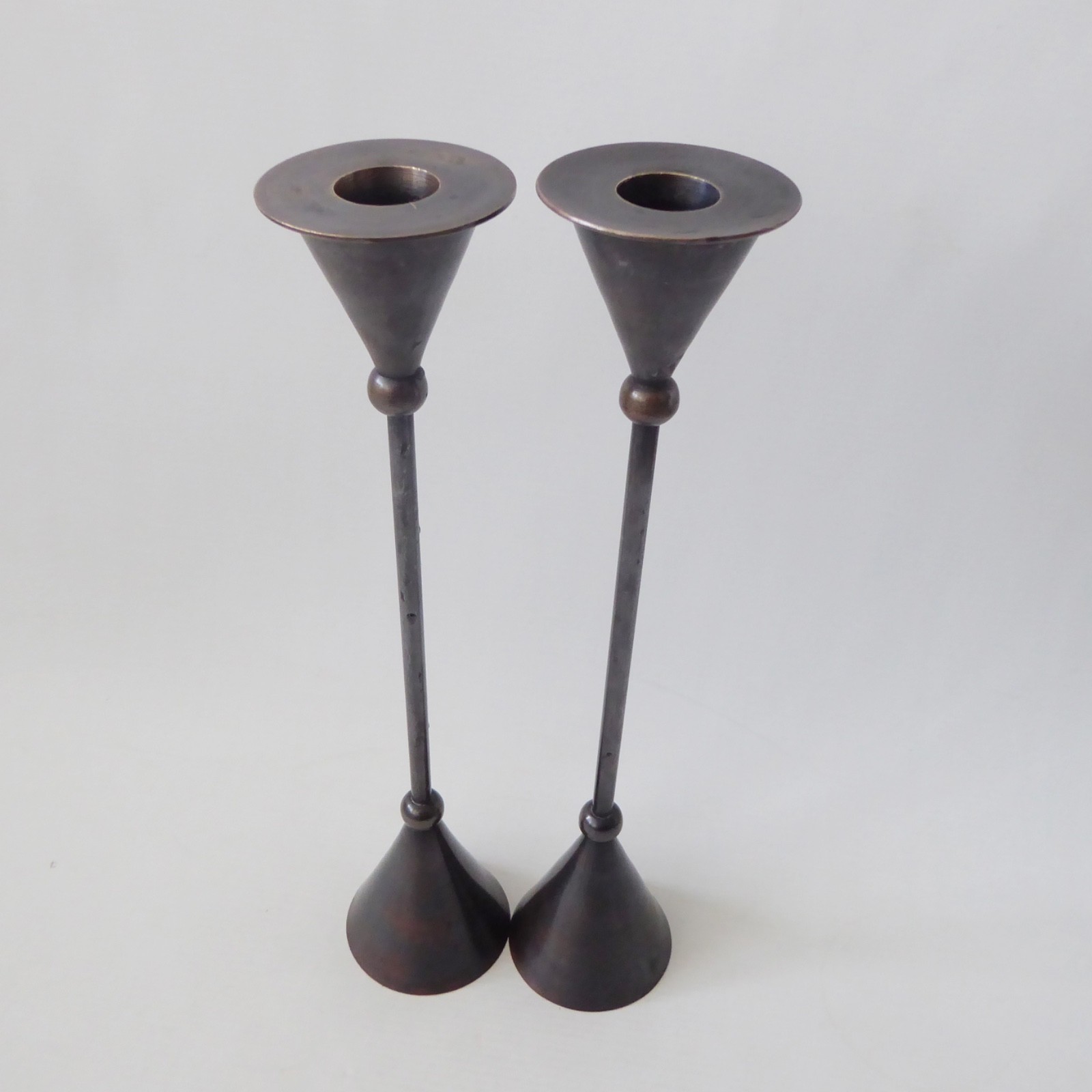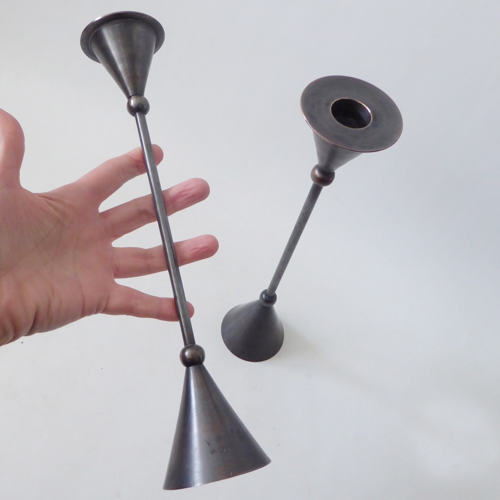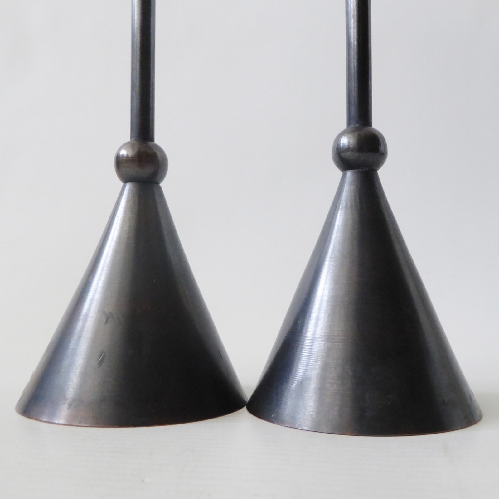 Pair candlesticks, post modernist Memphis 1980s style, blackened brass 30cm tall