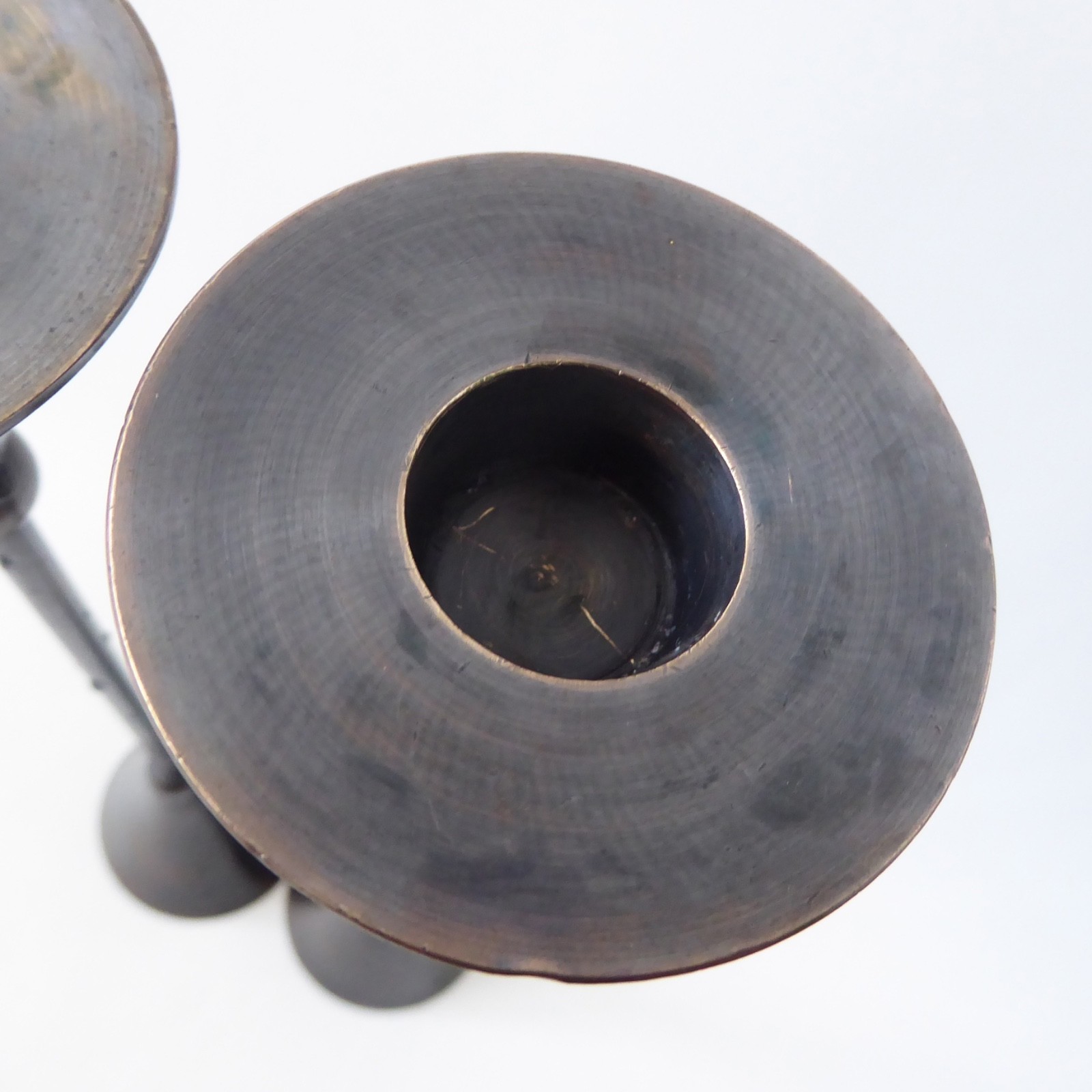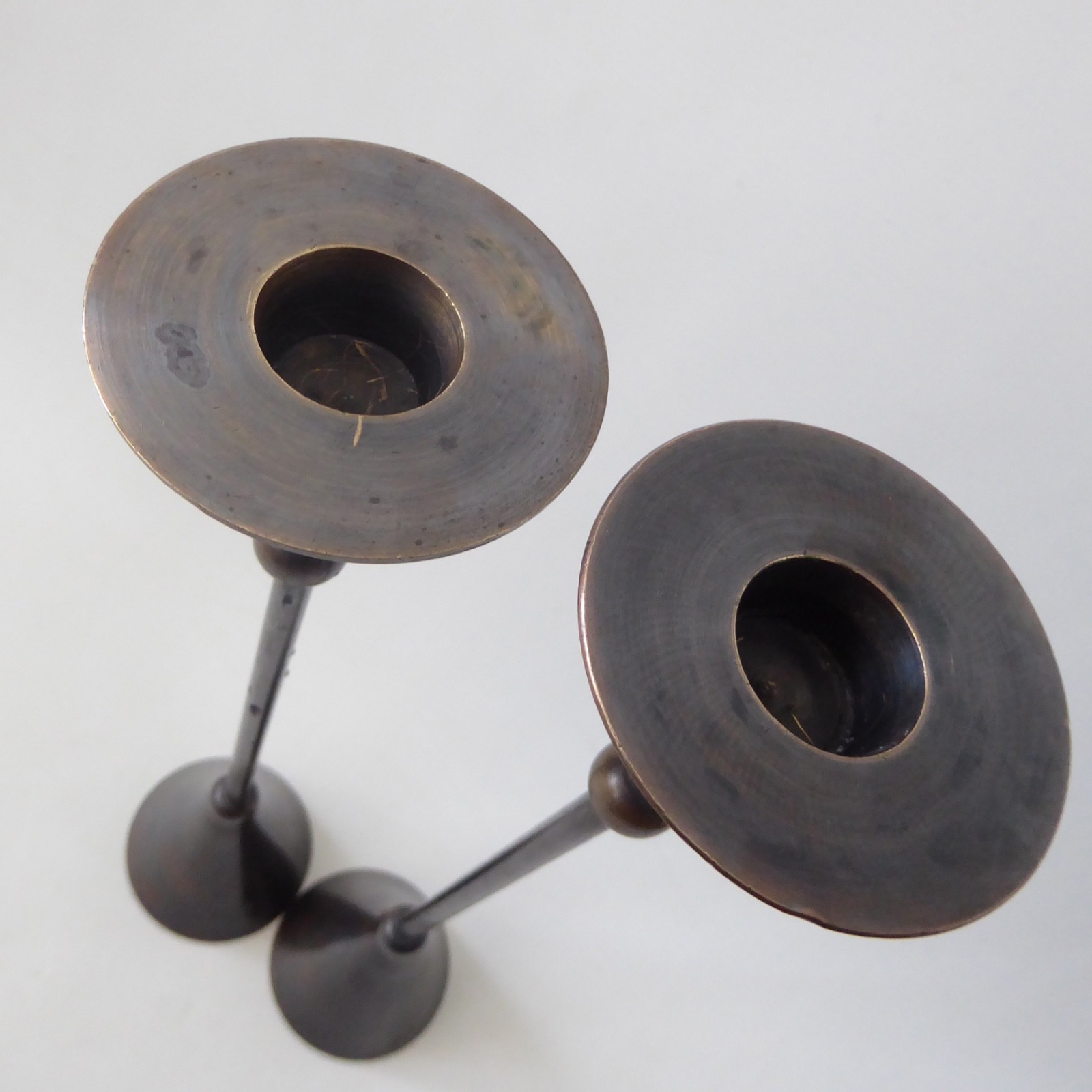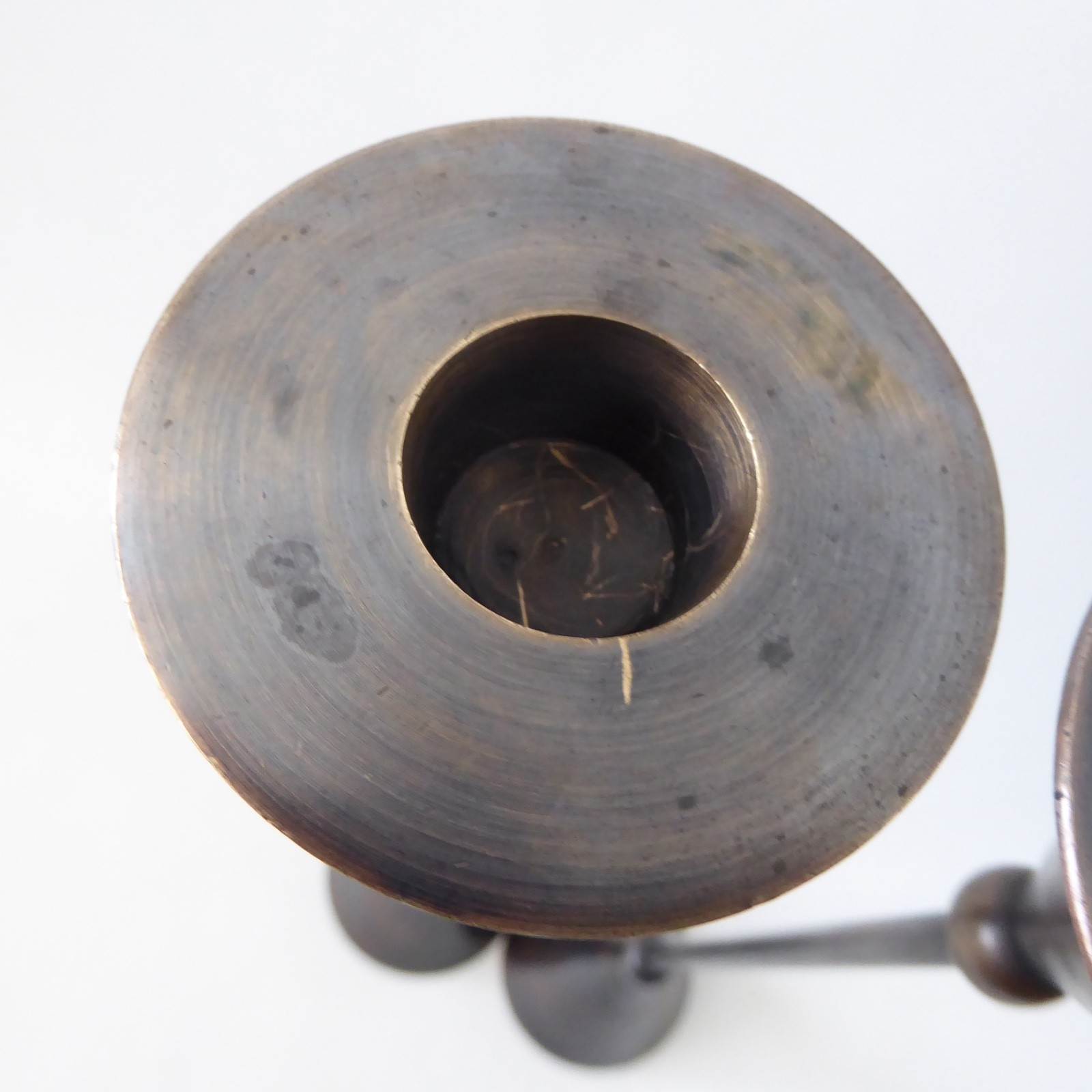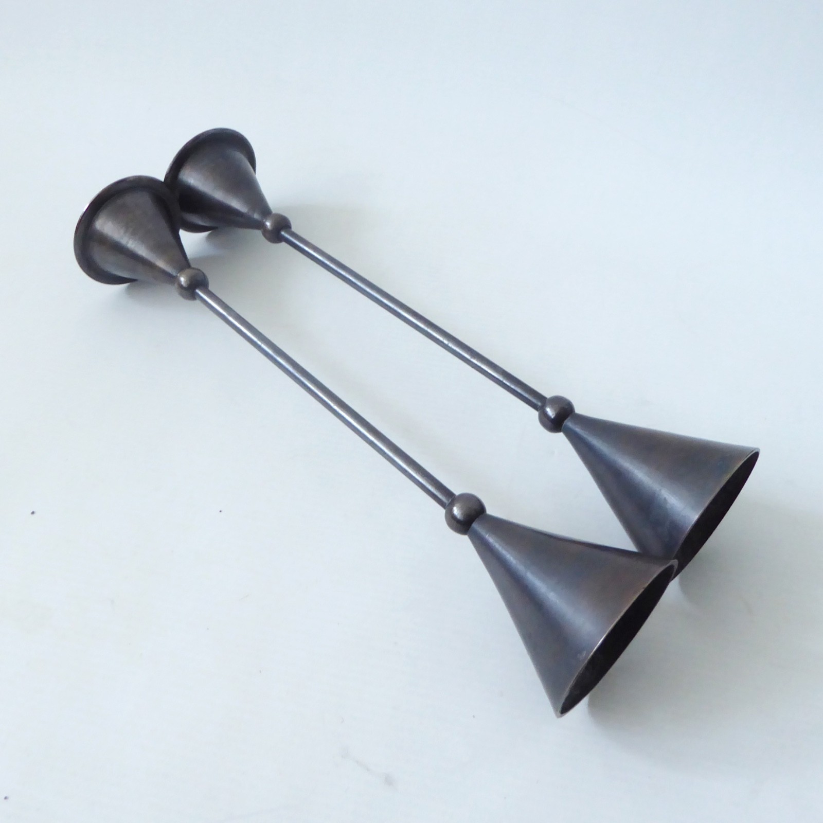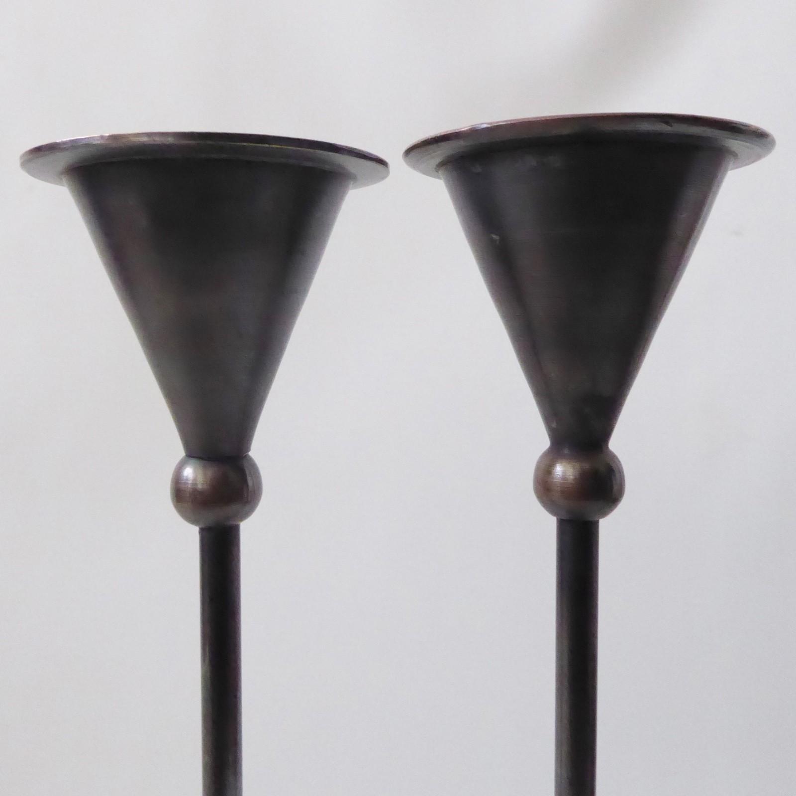 Pair candlesticks, post modernist Memphis 1980s style, blackened brass 30cm tall