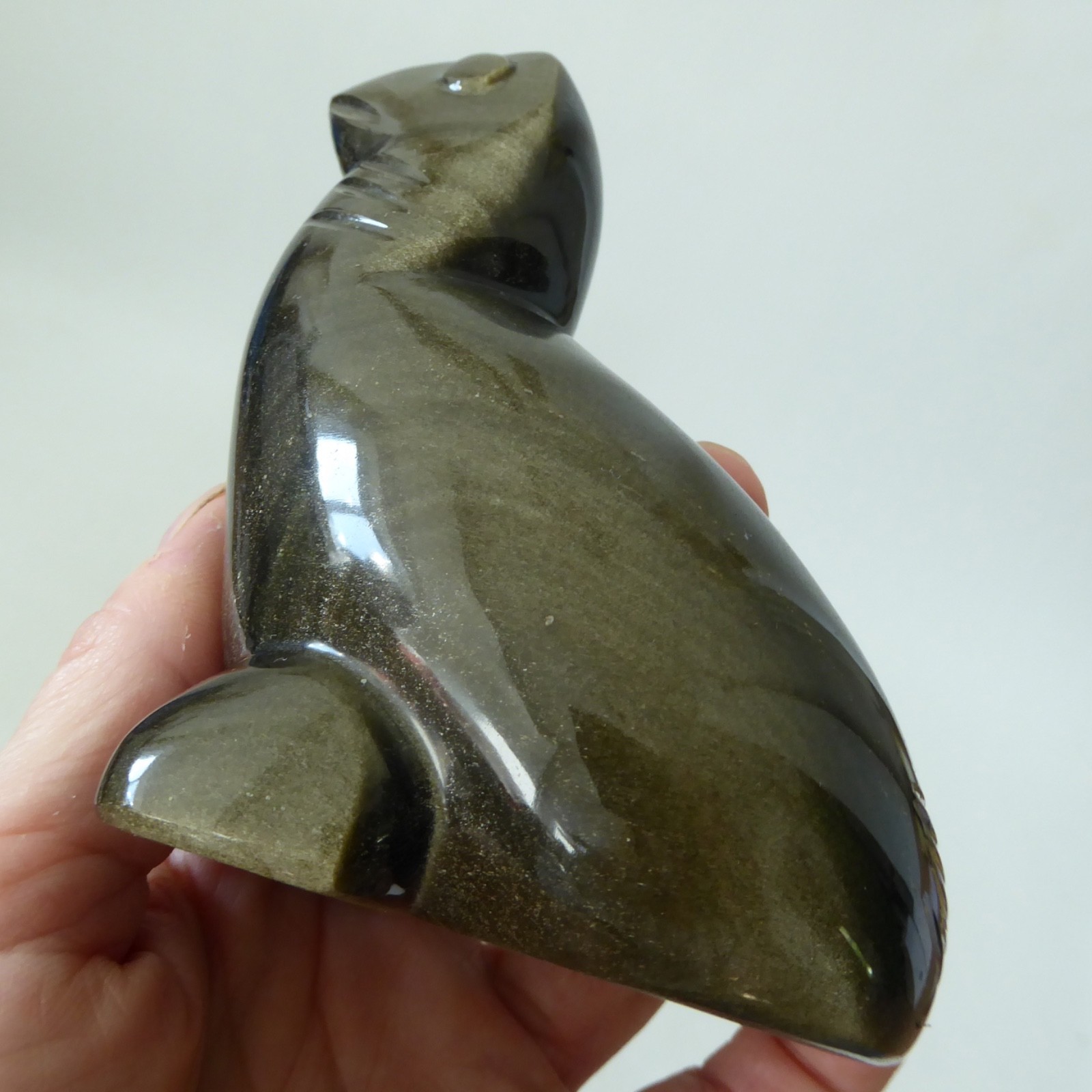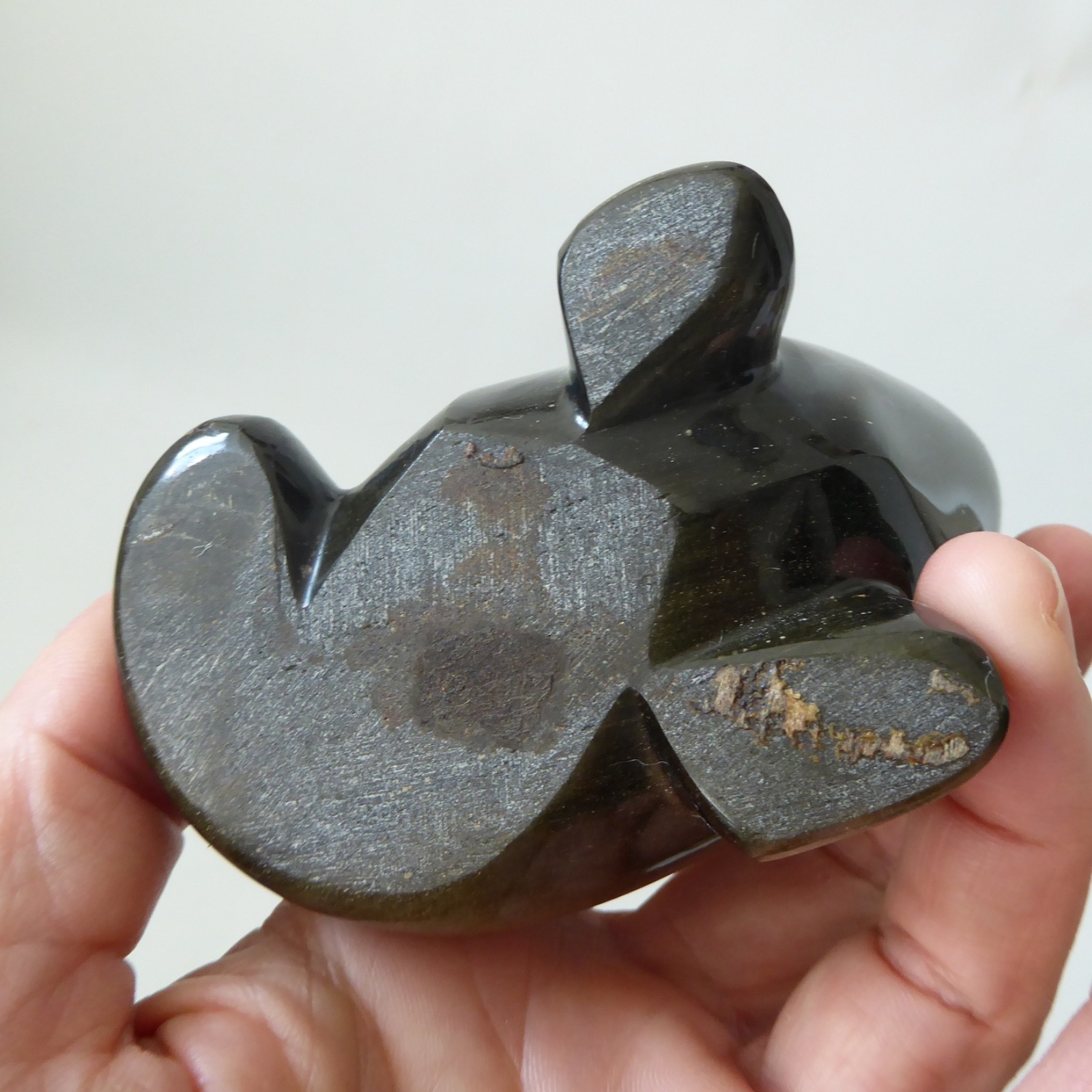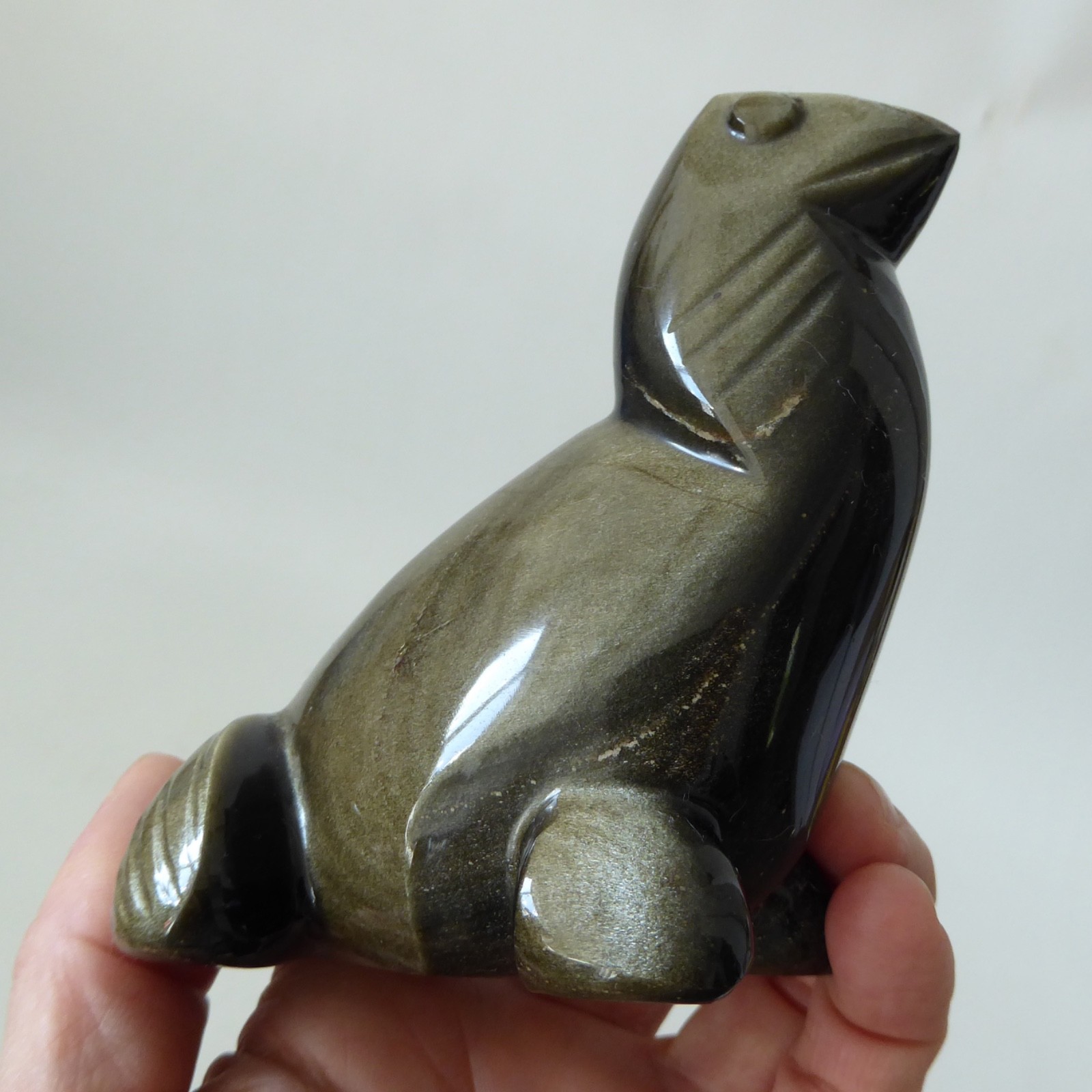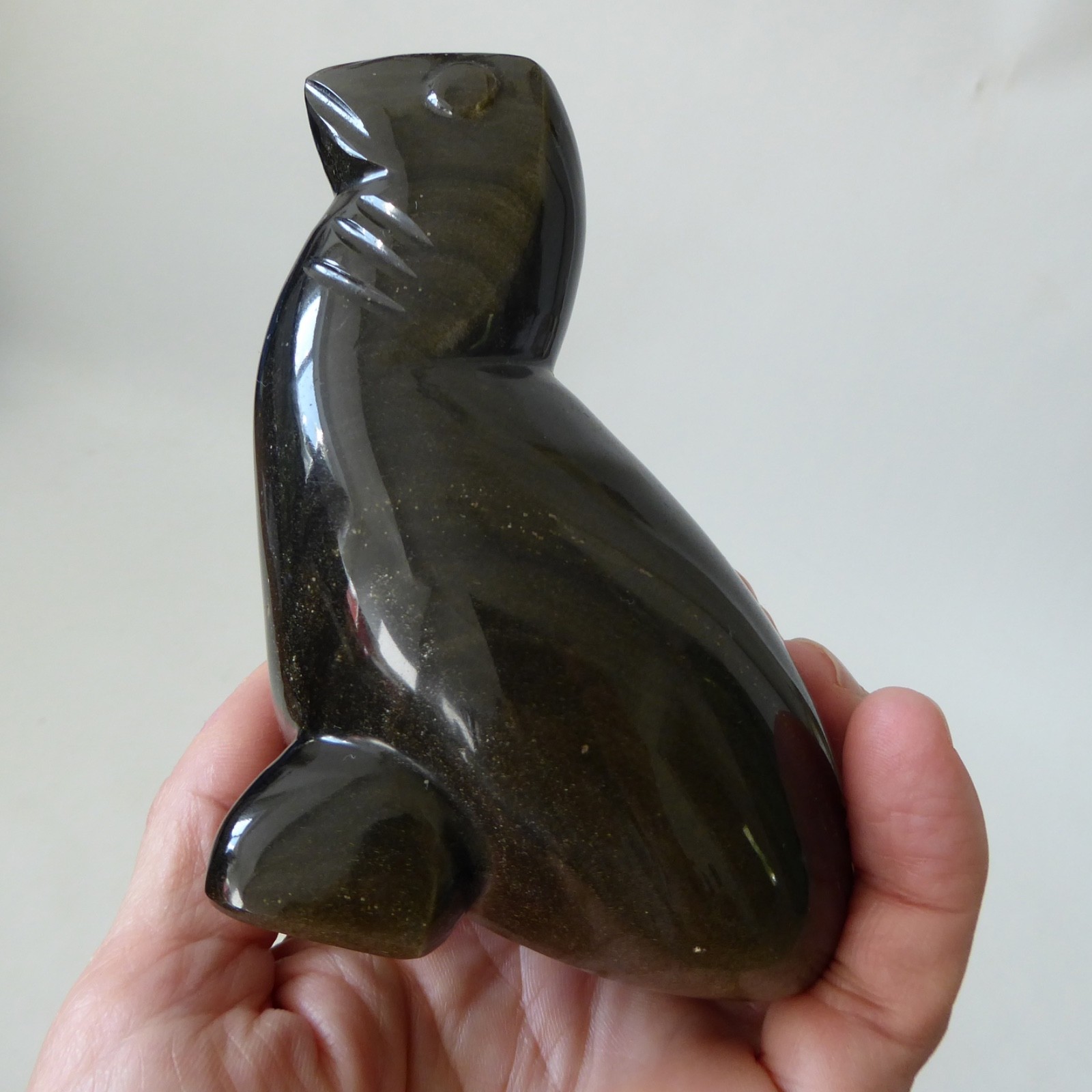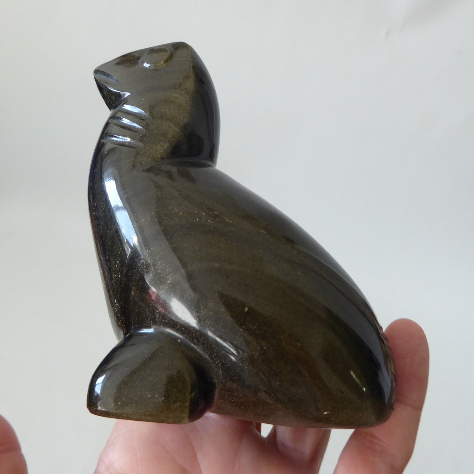 Carved from a black stone with an iridescent goldy silvery finish, like a Tiger’s Eye.