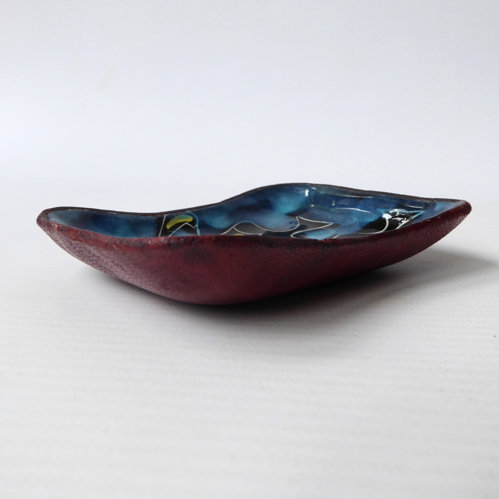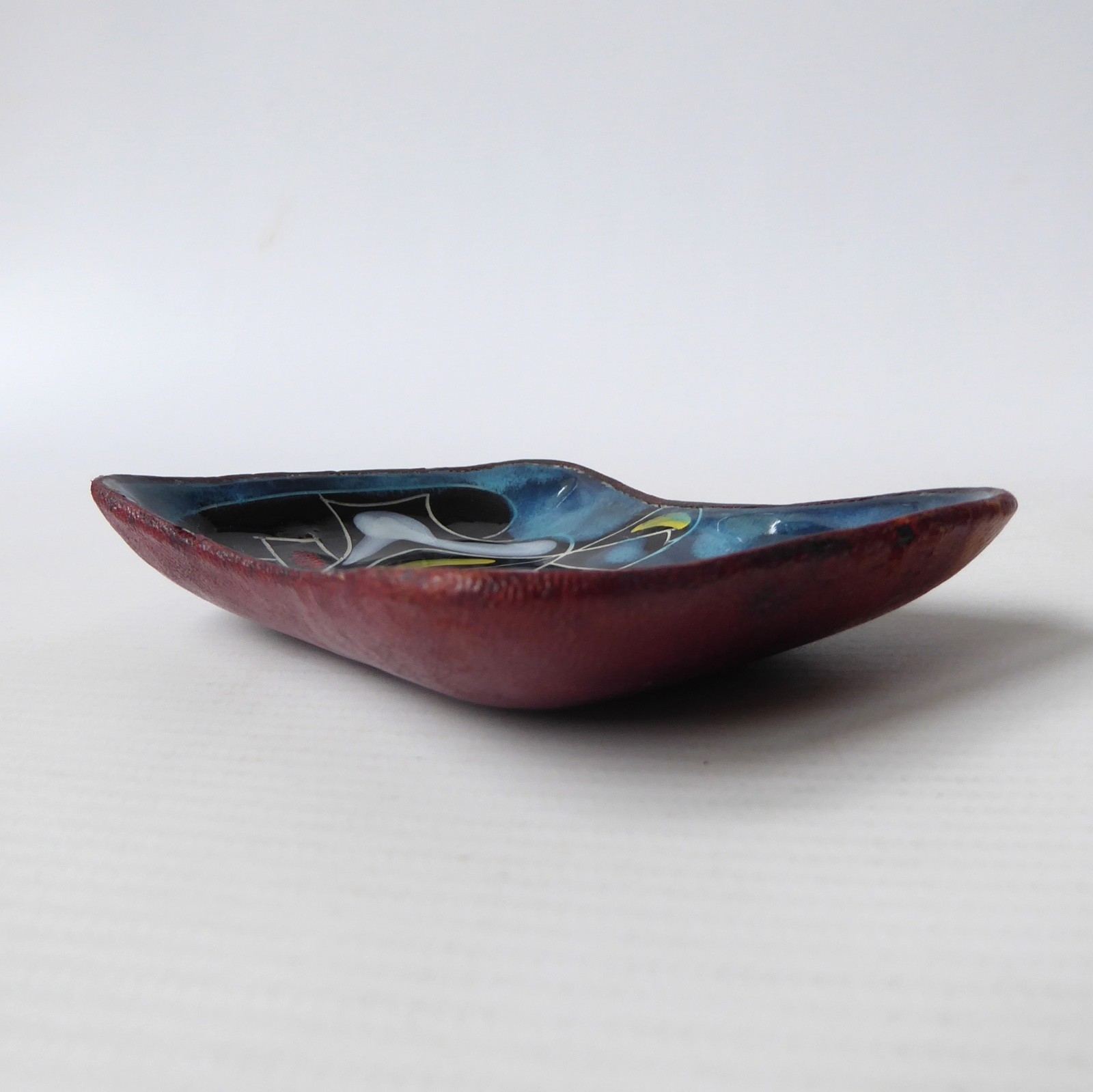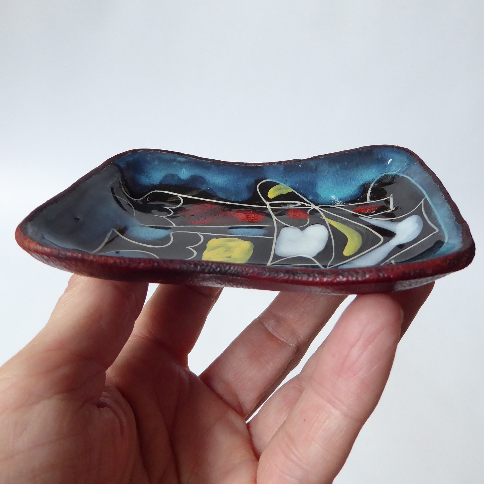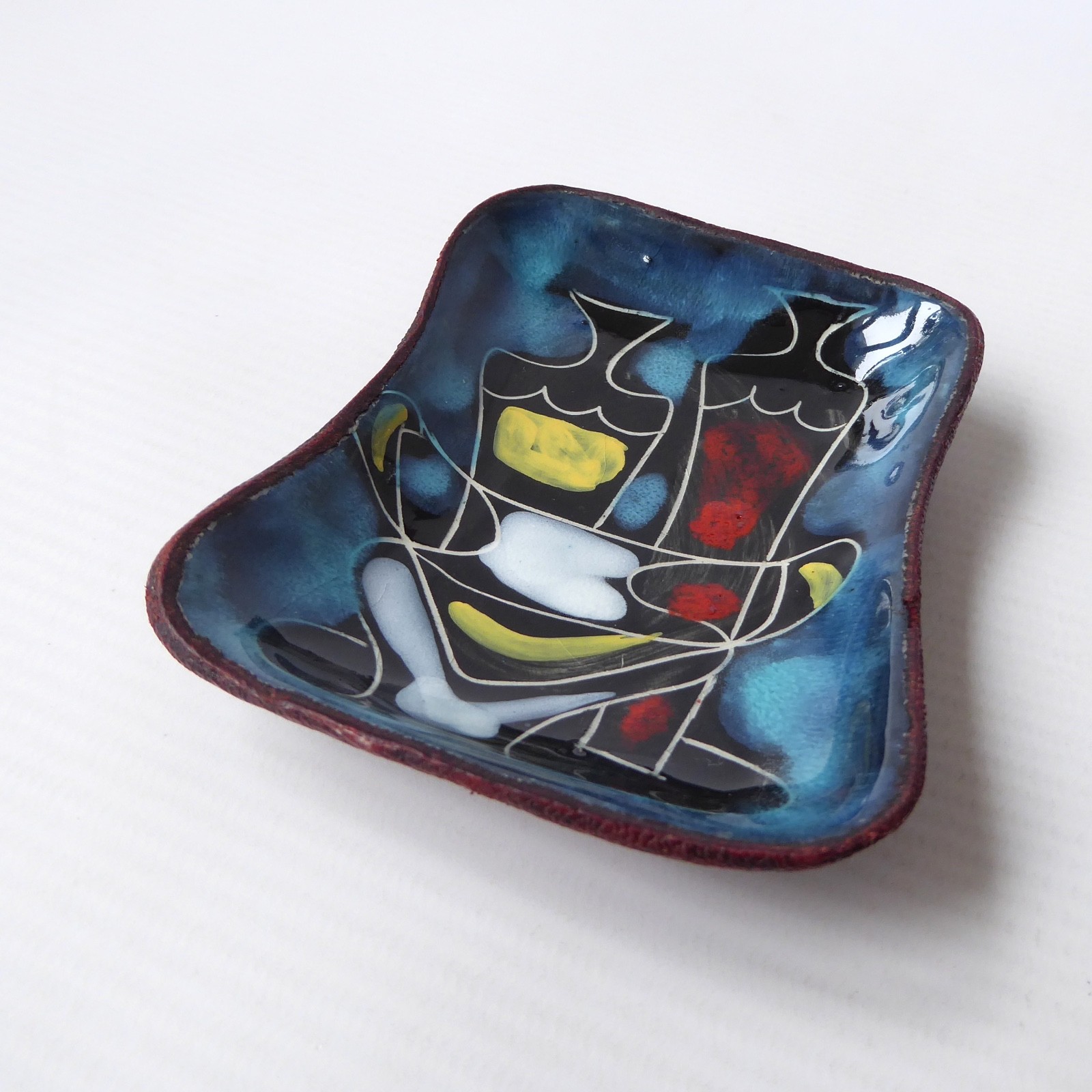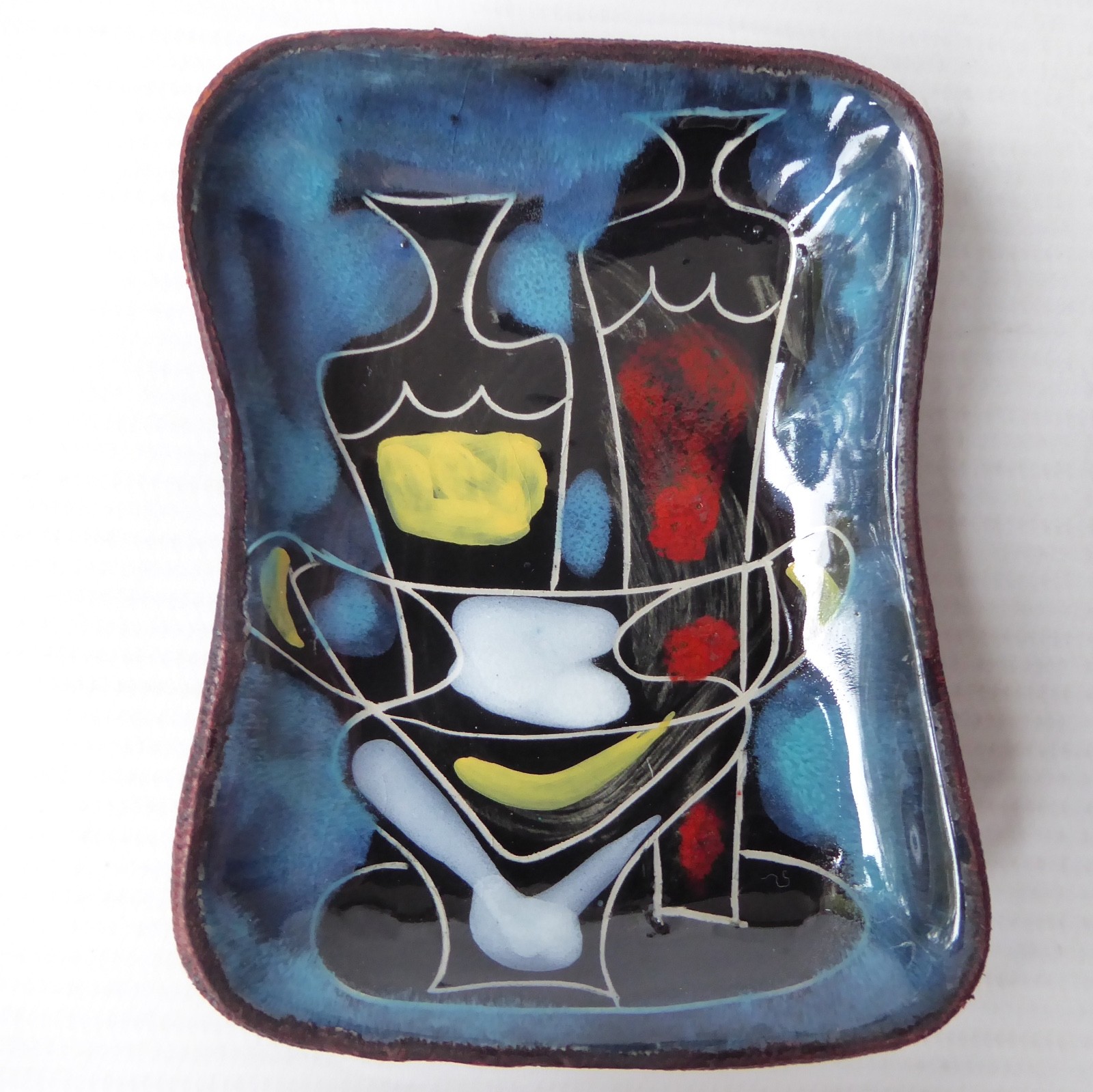 Blue background, imagery of black bottles/ornaments with hand painted infills of colour and sgraffito white lines.