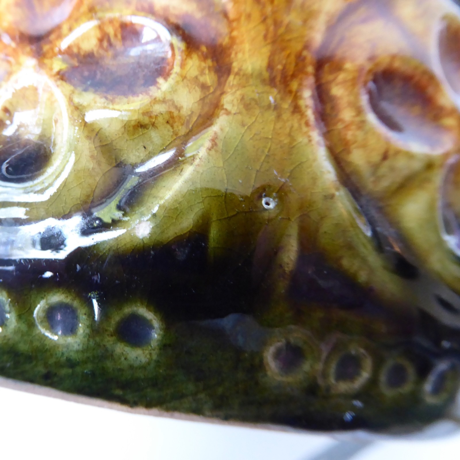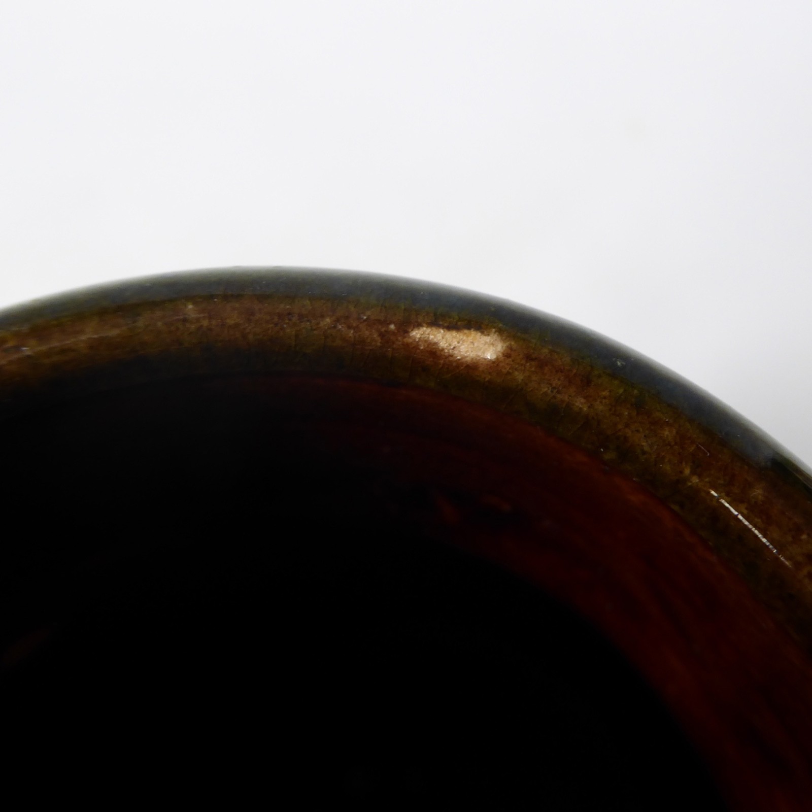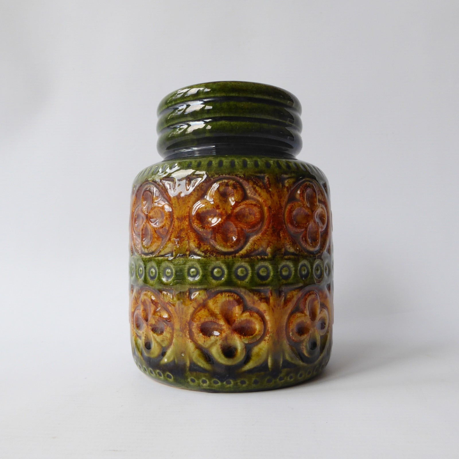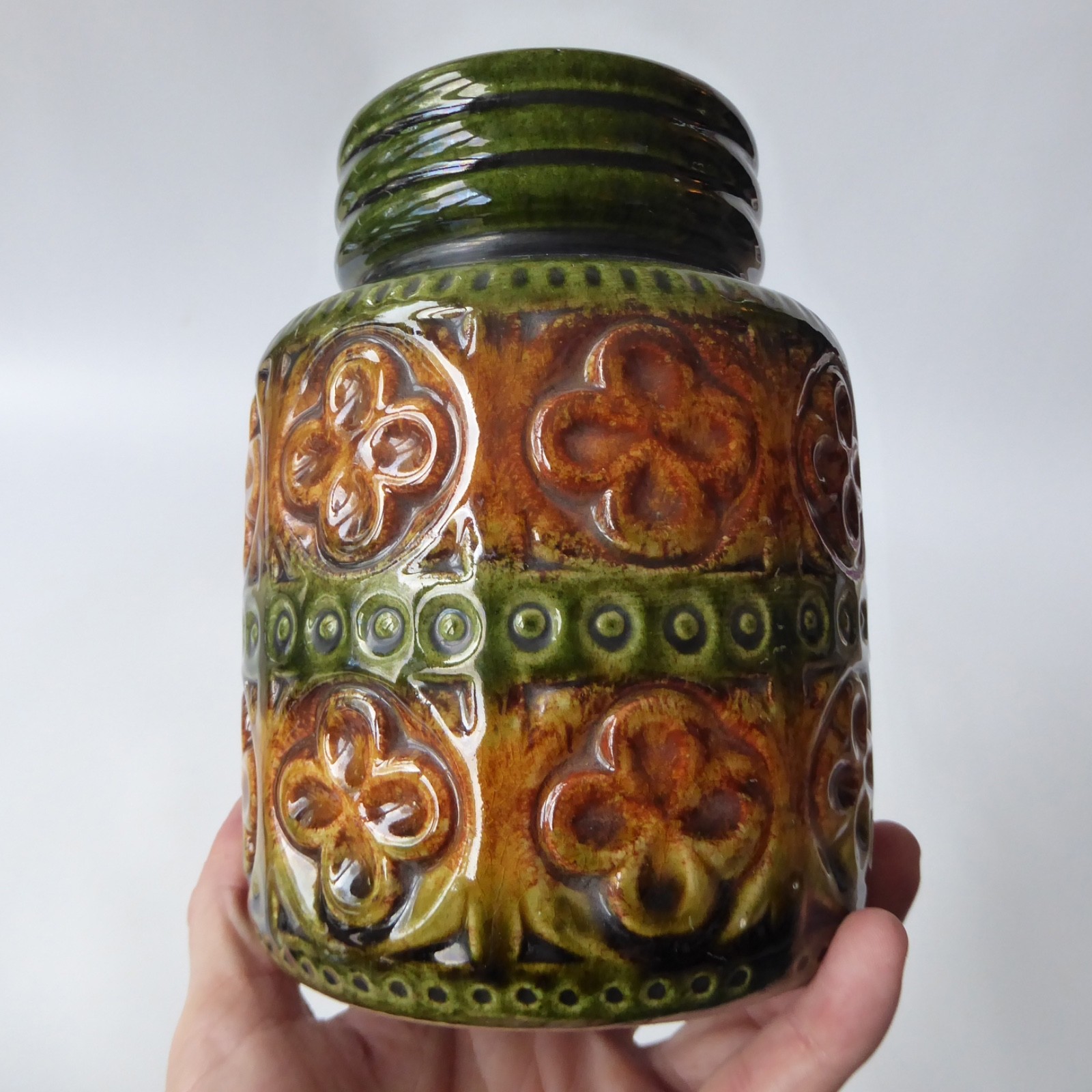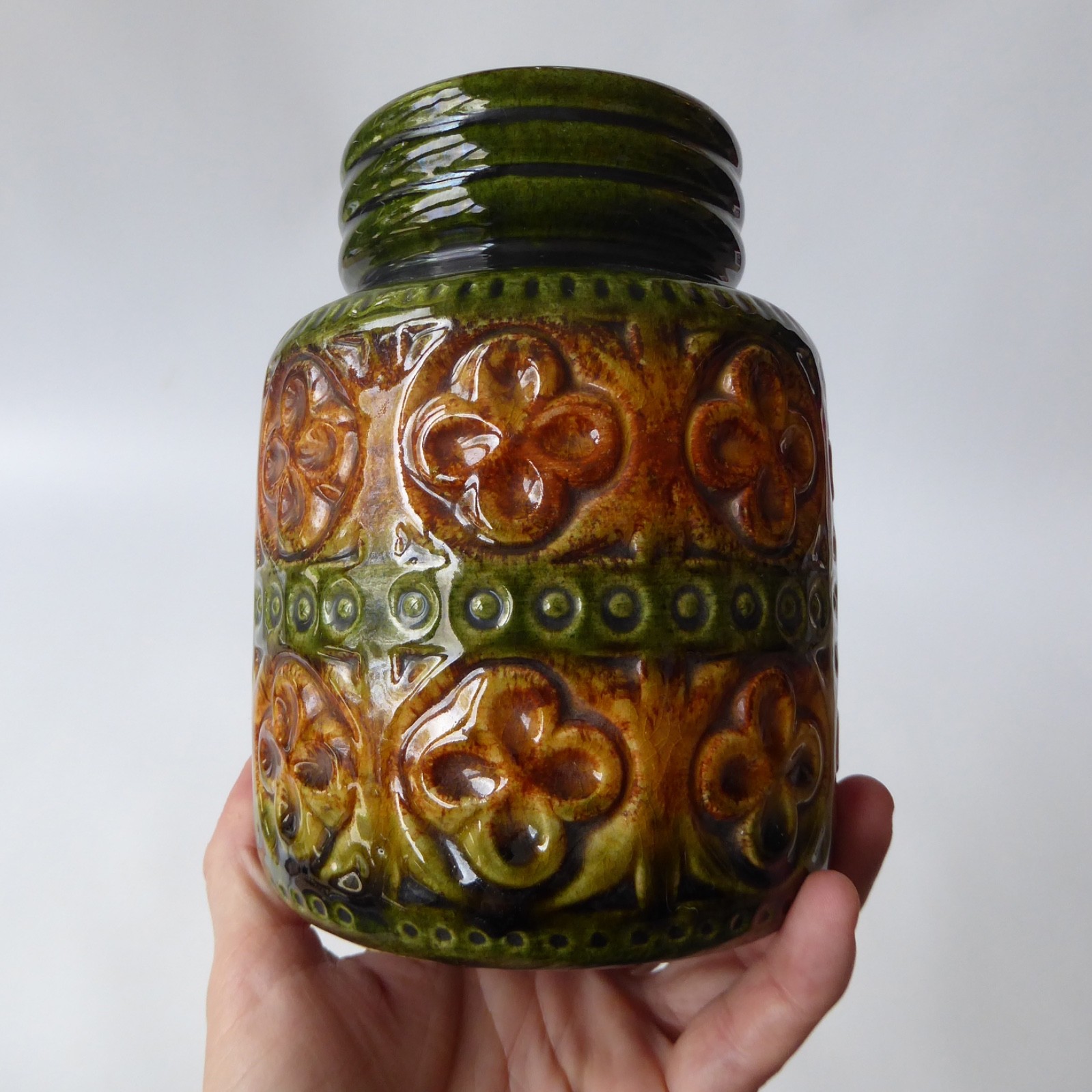 Dating from the ‘fat lava’ 1960s/1970s era, this has a warm yellowy/ochre tan tones with dark olive green stripes.